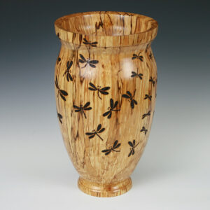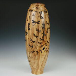 19″ Tall Myrtlewood Vessel turned on the lathe by Jim Hodson. Struck by lightning and very carefully turned on the lathe and carved to highlight Natures Design. This one took extra special skill to keep it all together while spinning on the lathe.