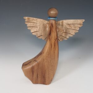 Myrtlewood Angel. Sizes, shapes, wood color, varies. Some have jeweled collars, some have ribbon scarves. about 4-5″ tall with a 4″ wingspan Sold individually