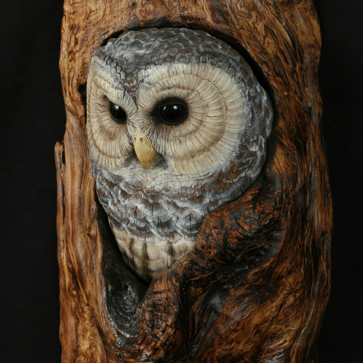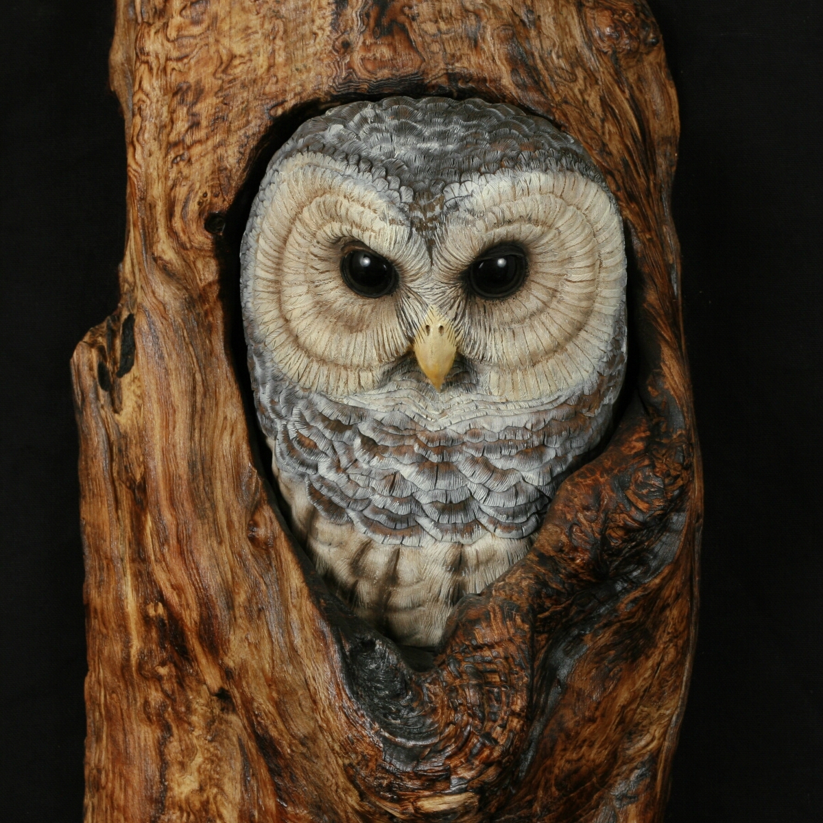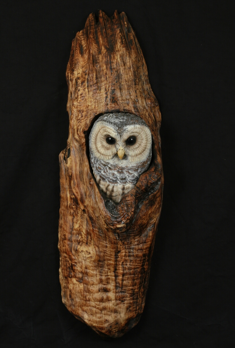 The owl is carved out of Tupelo and is mounted in a natural myrtlewood limb knot.