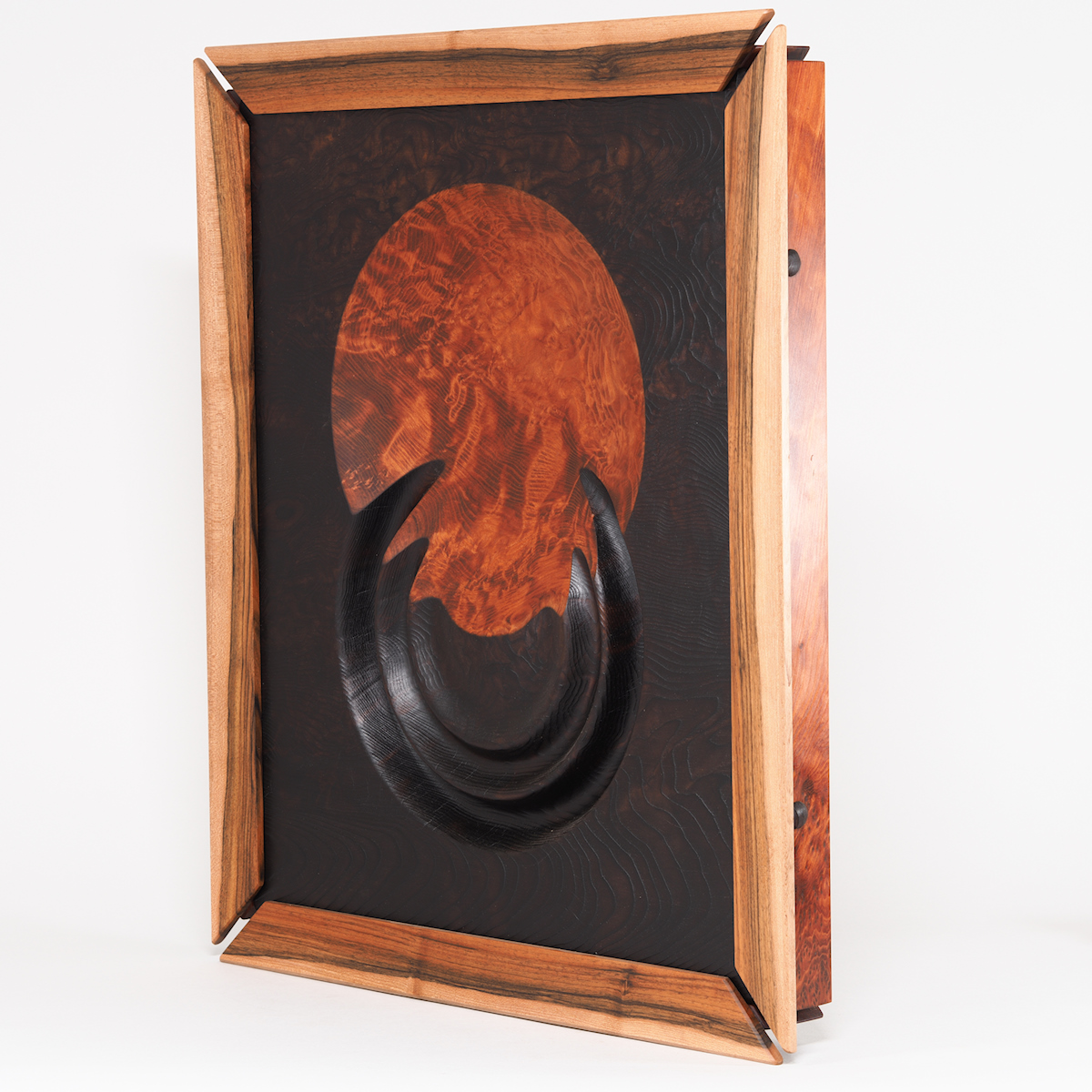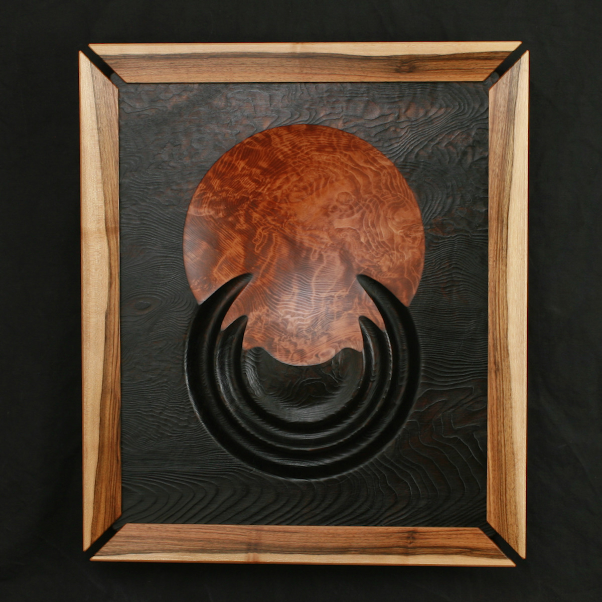 A multi axis turning with burnt wood grain texture on Redwood Burl with a floating walnut frame.