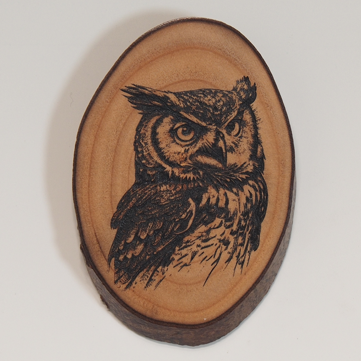 Then we move on to the computer and engraver where we design, tweak, engrave, redesign, engrave again, and repeat until we end up with a pleasing combination that merges the detailed design with the natural beauty of myrtlewood.