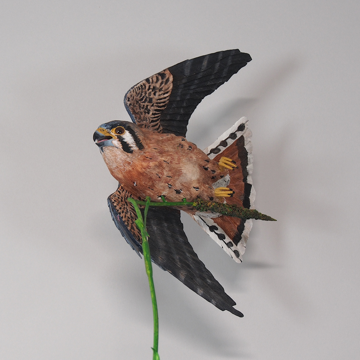 Flying Kestrel hand carved and painted out of wood, mounted on a grass reed made out of brass and set into an ironwood base on a rock slab.