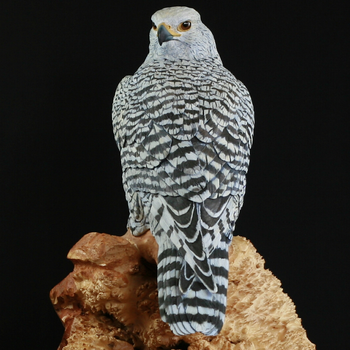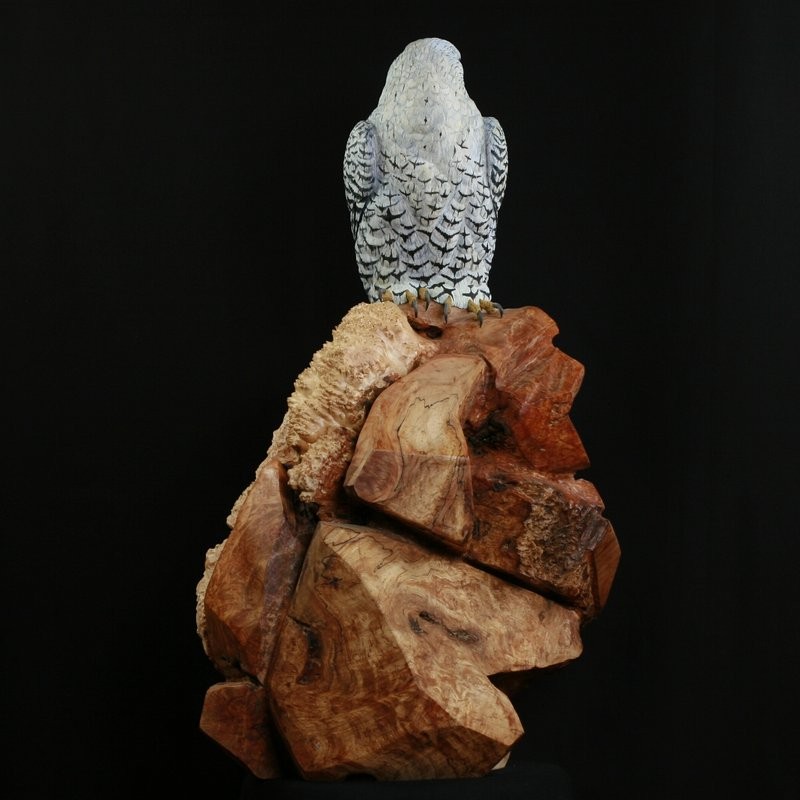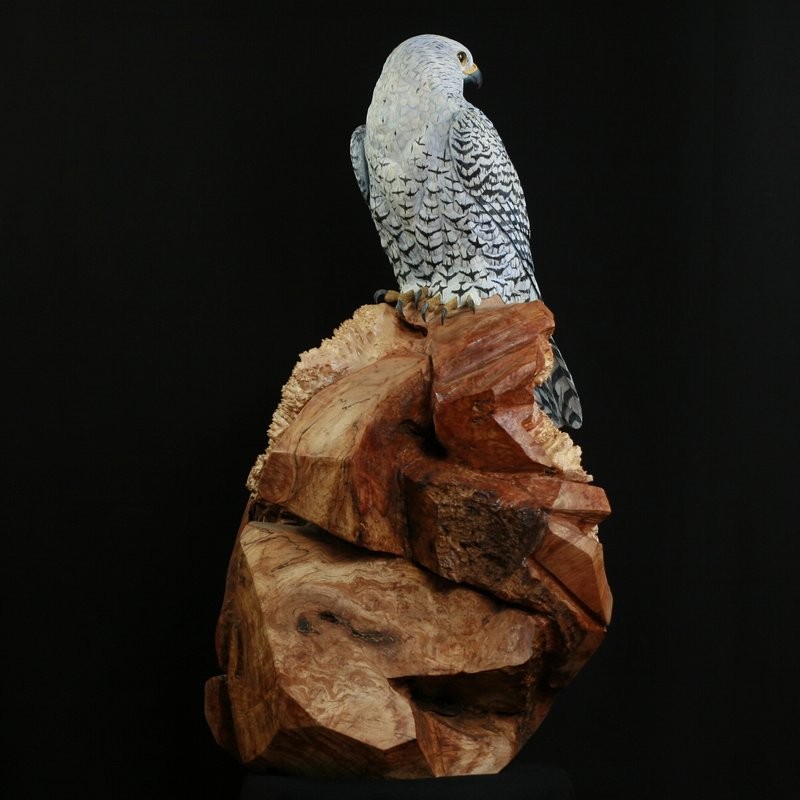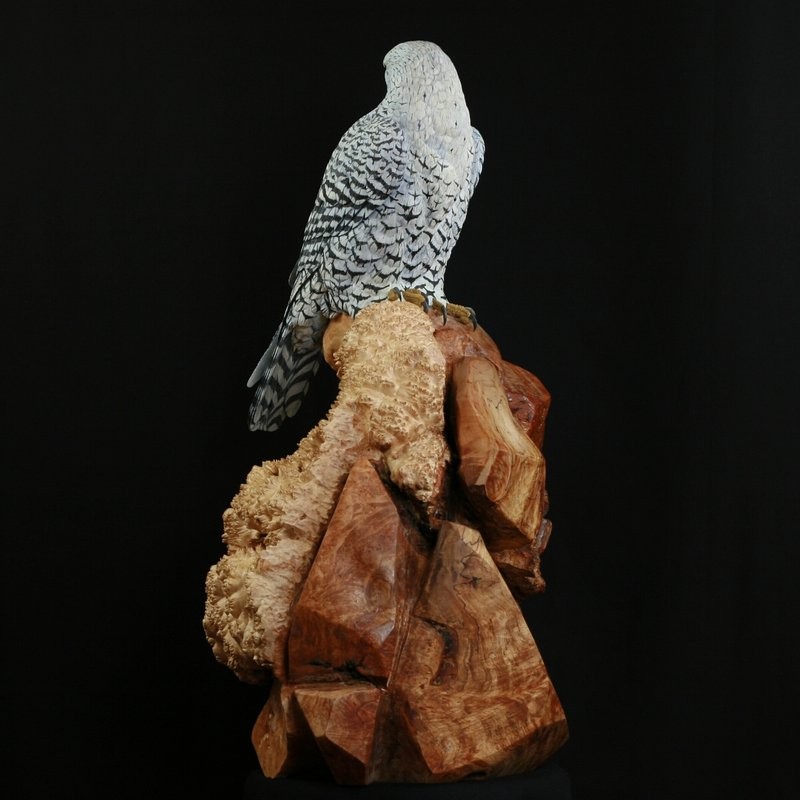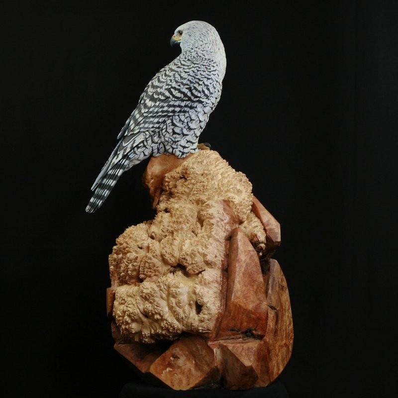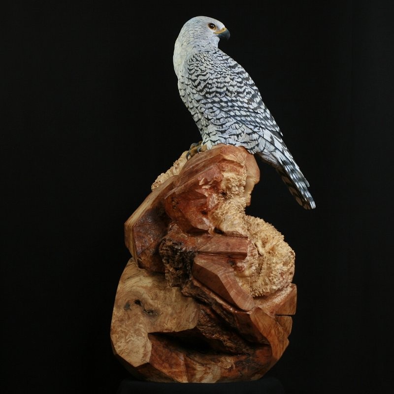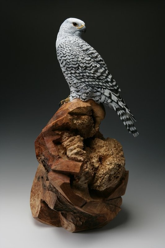 This Sculpture, hand carved from Tupelo wood and painted in acrylics, is a Gyrfalcon. He is the largest most powerful falcon in the world. The Base is carved from a large Maple Burl to simulate the rocky outcrop in the Tundra where they would watch for prey. In medieval times they were used in Falconry, particularly the white phase was sought after by kings and queens as a sign of wealth and power and only they were allowed to have them. The Gyrfalcon is the Mascot, of the US Airforce Academy in Colorado Springs, Colorado. Here in North America Gyrfalcon are found in Alaska and Northern Canada.