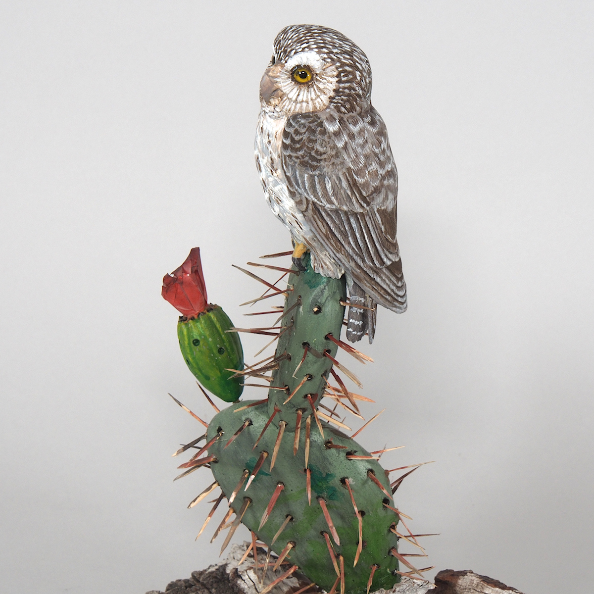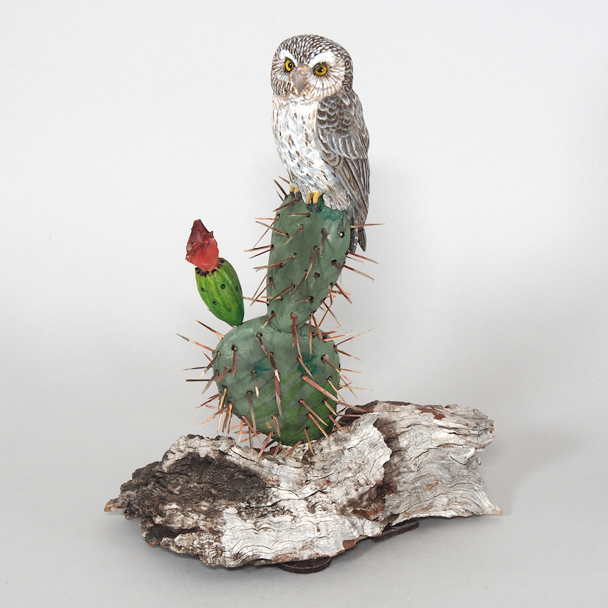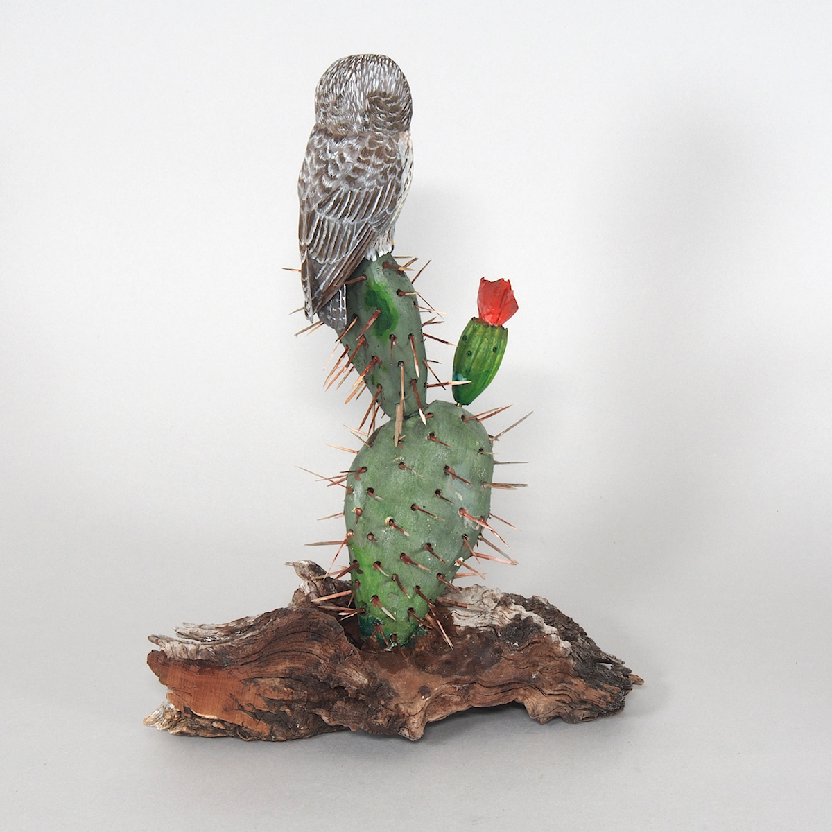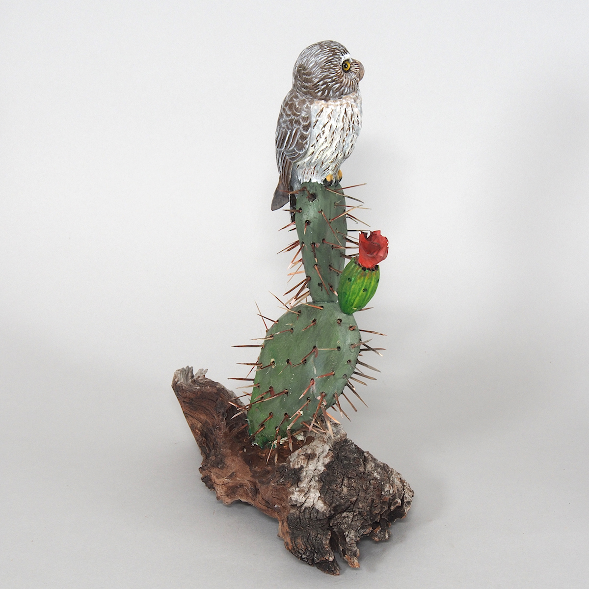 The owl is carved out of Tupelo and is mounted on a handmade wood cactus mounted on a rustic wood base.