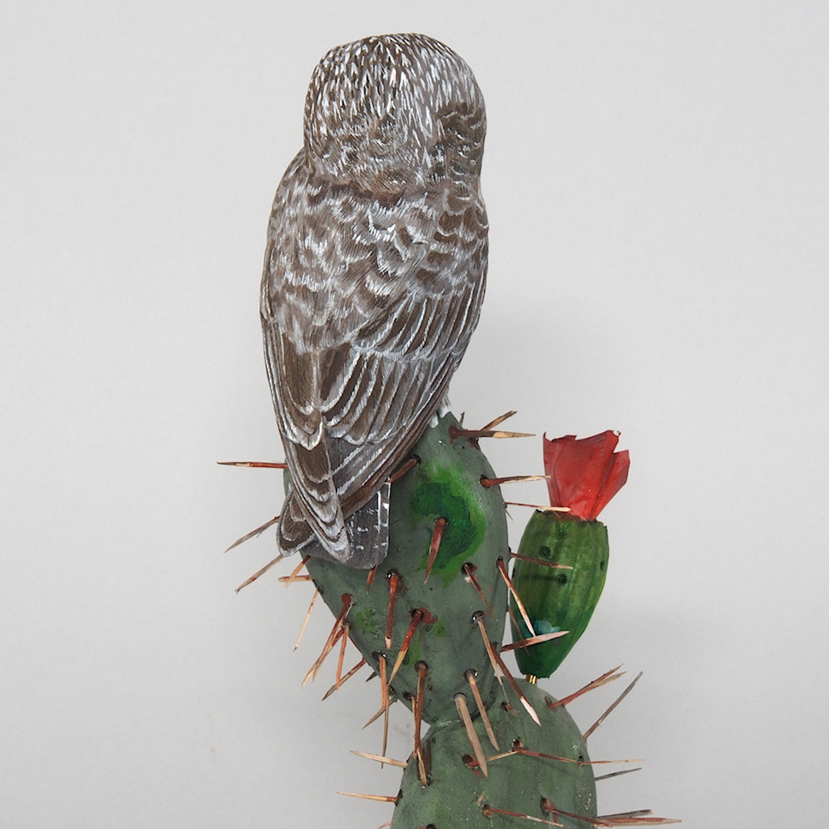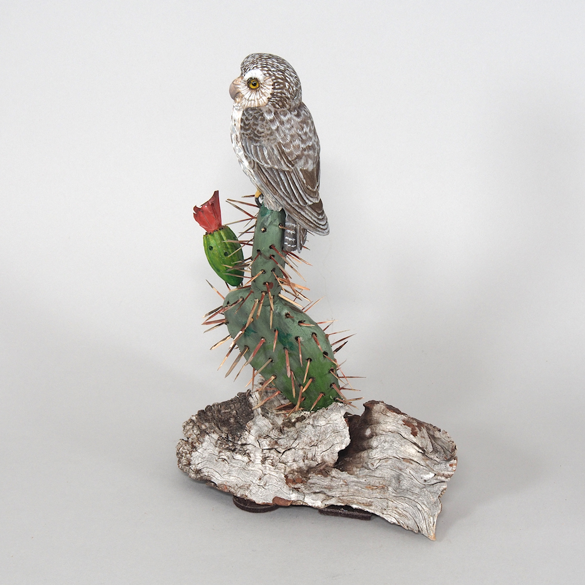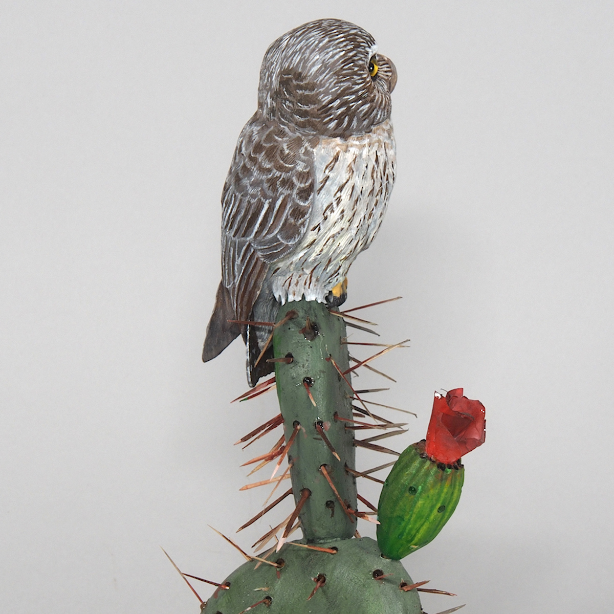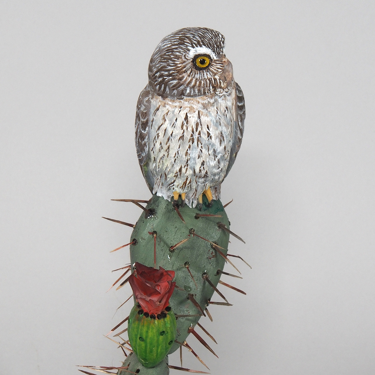 The owl is carved out of Tupelo and is mounted on a handmade wood cactus mounted on a rustic wood base.