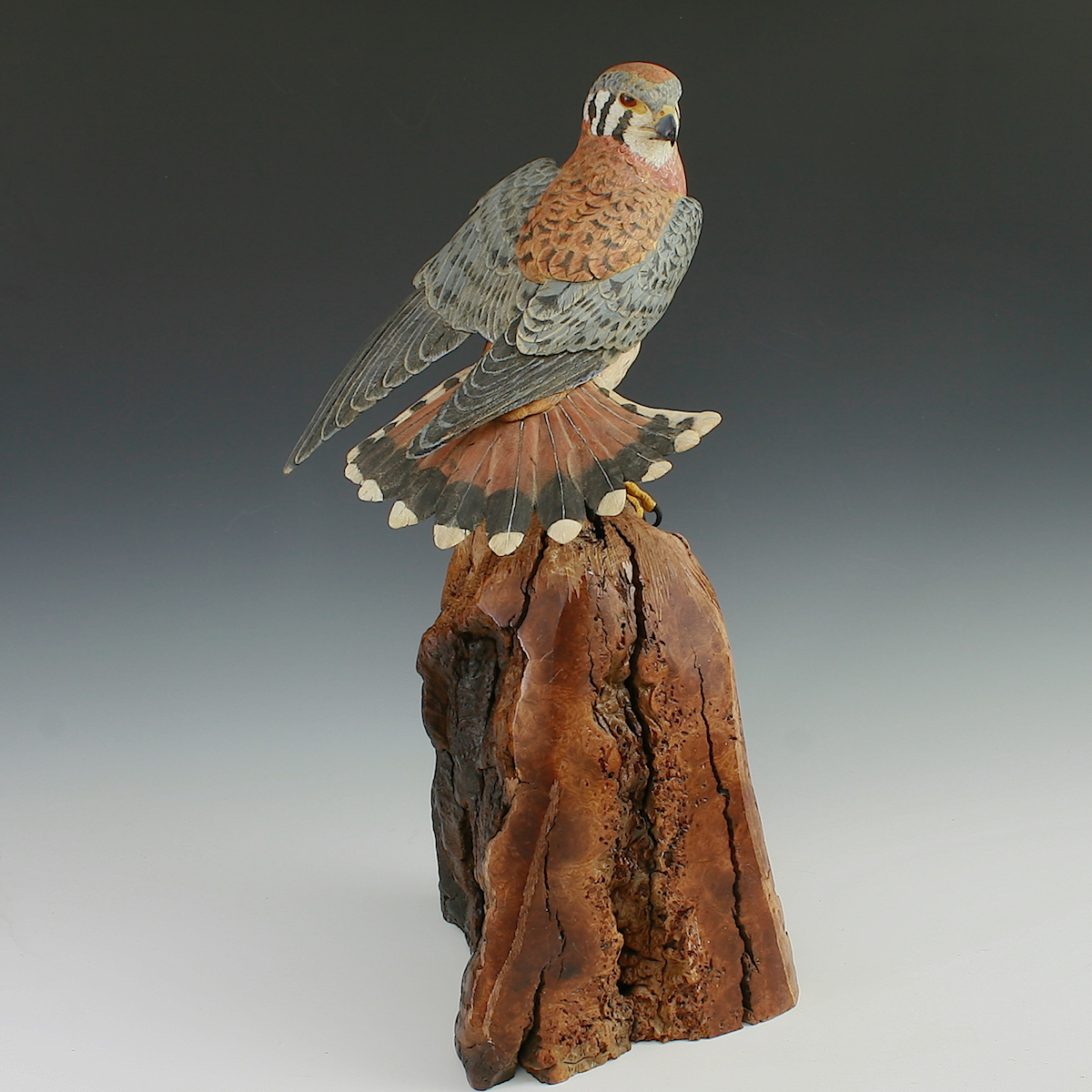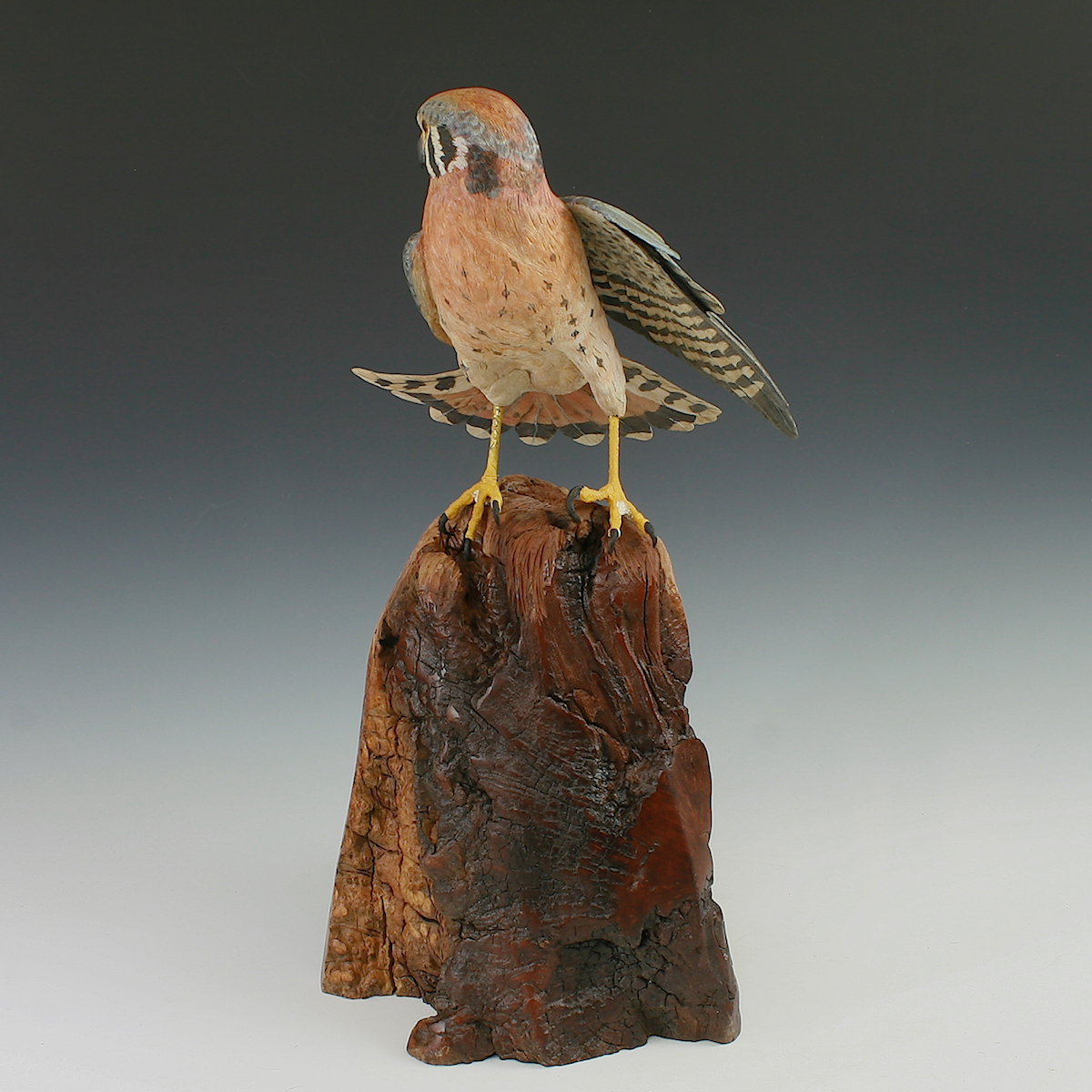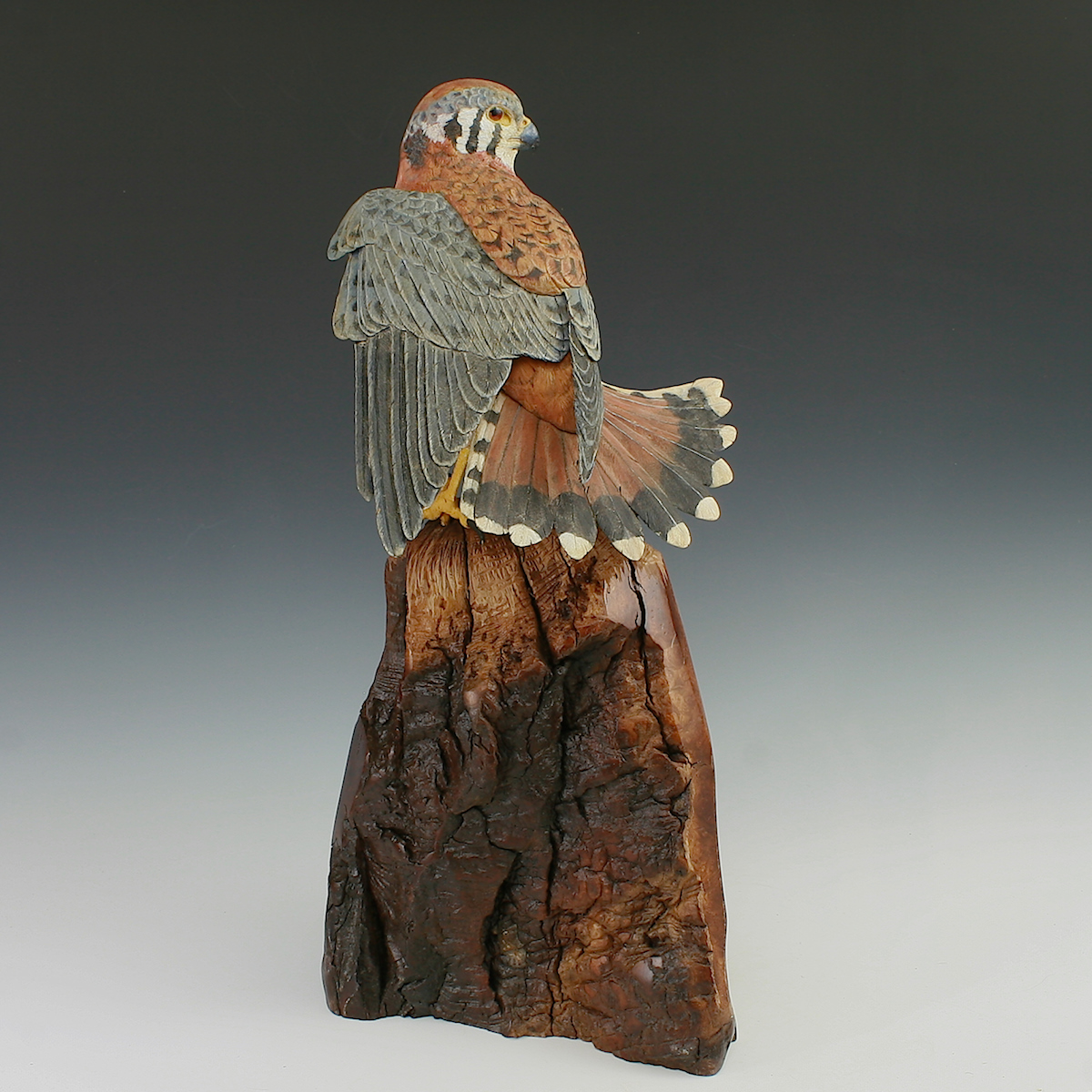 Hand Carved Kestrel Stretching with Flaired tail