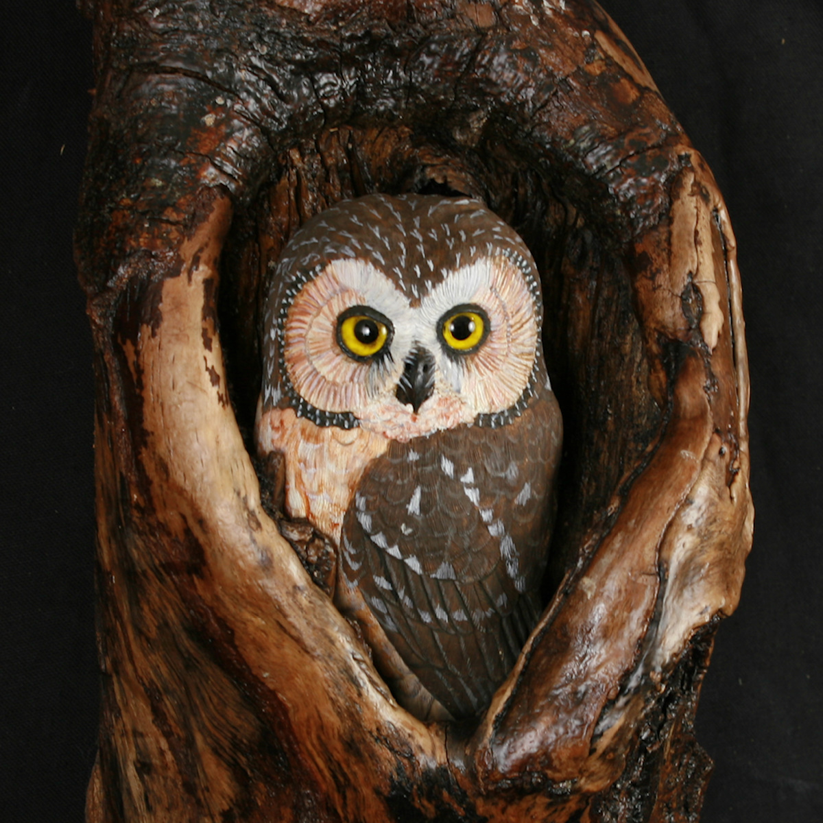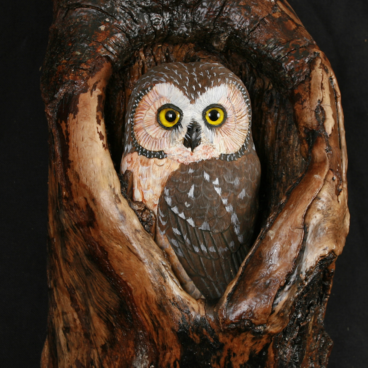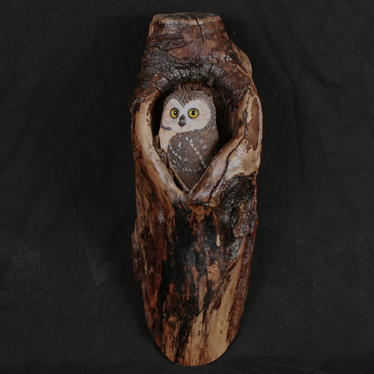The owl is carved out of Tupelo and is mounted in a natural alder knot l