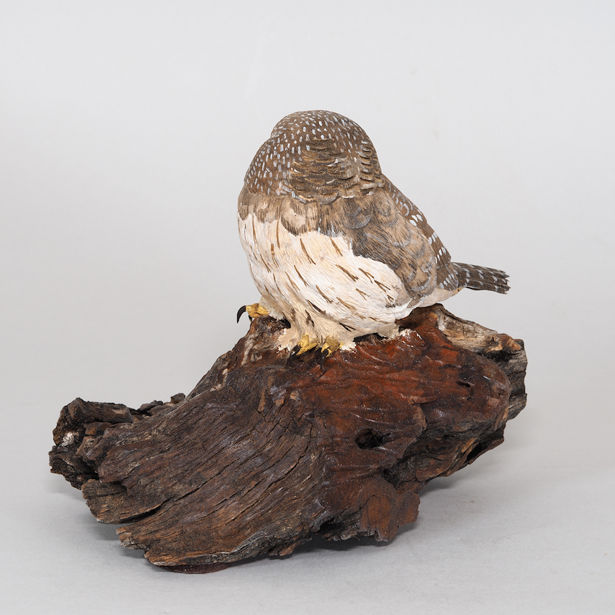 The owl is carved out of Tupelo and is mounted on a rustic burl.