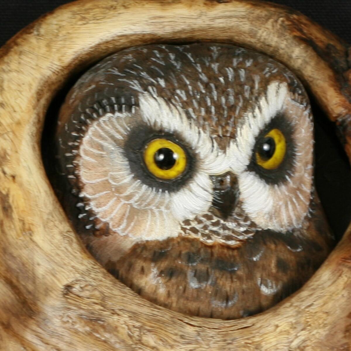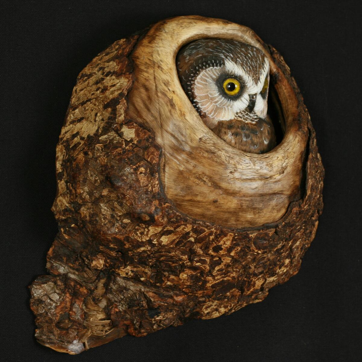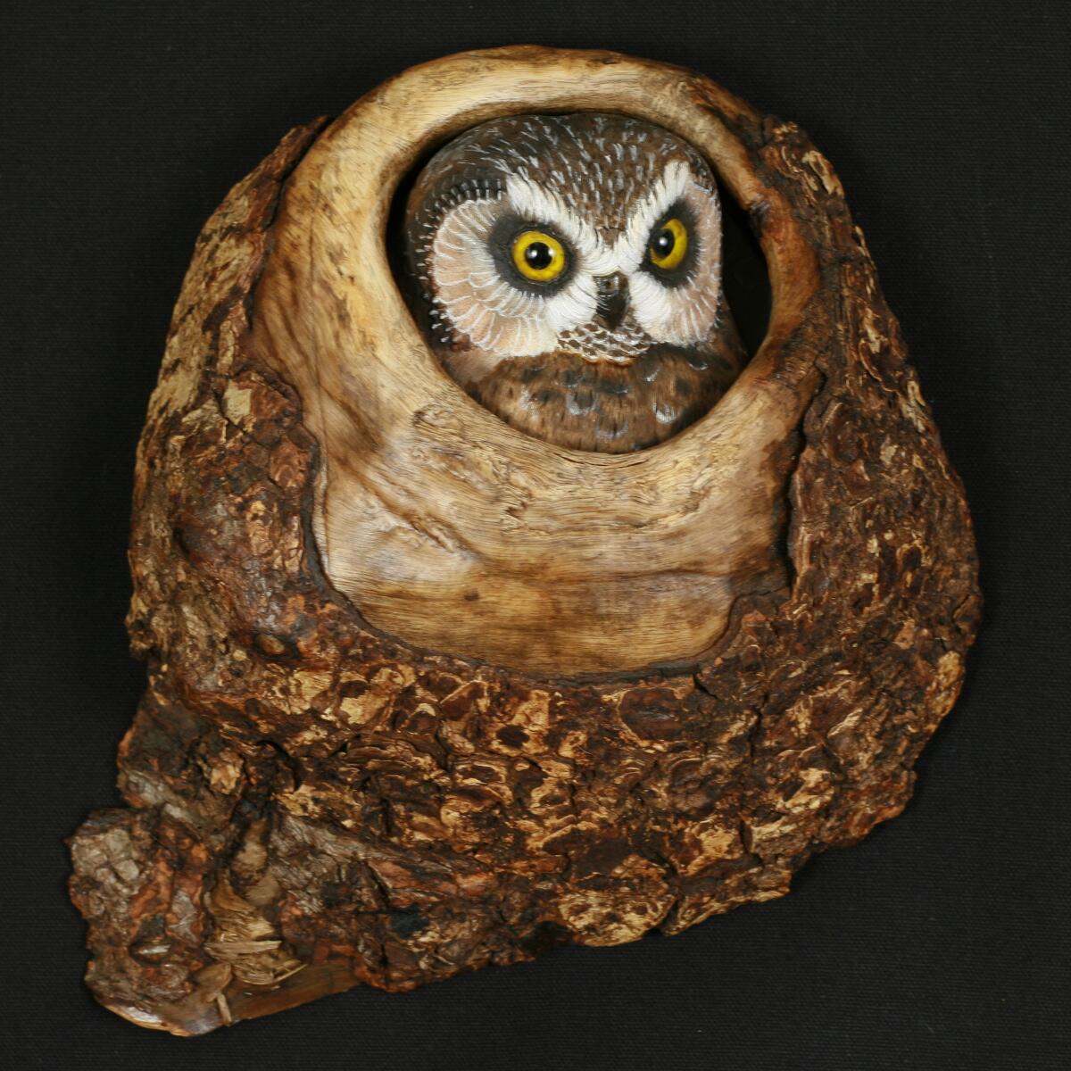 Hand Carved Saw-whet Owl in a Myrtlewood Tree knot