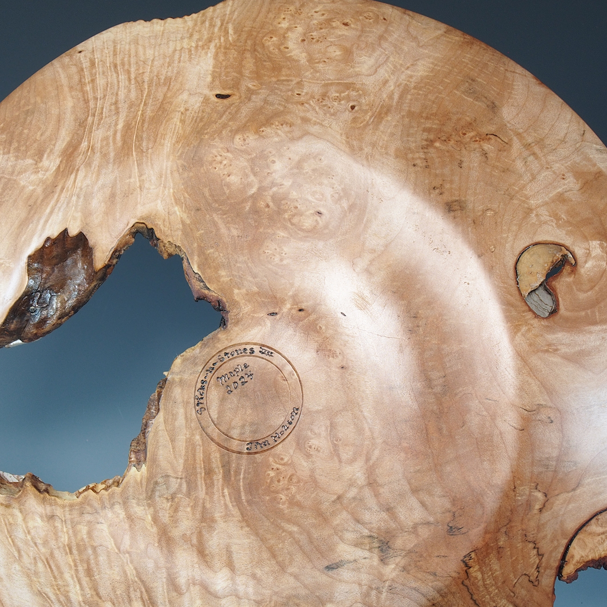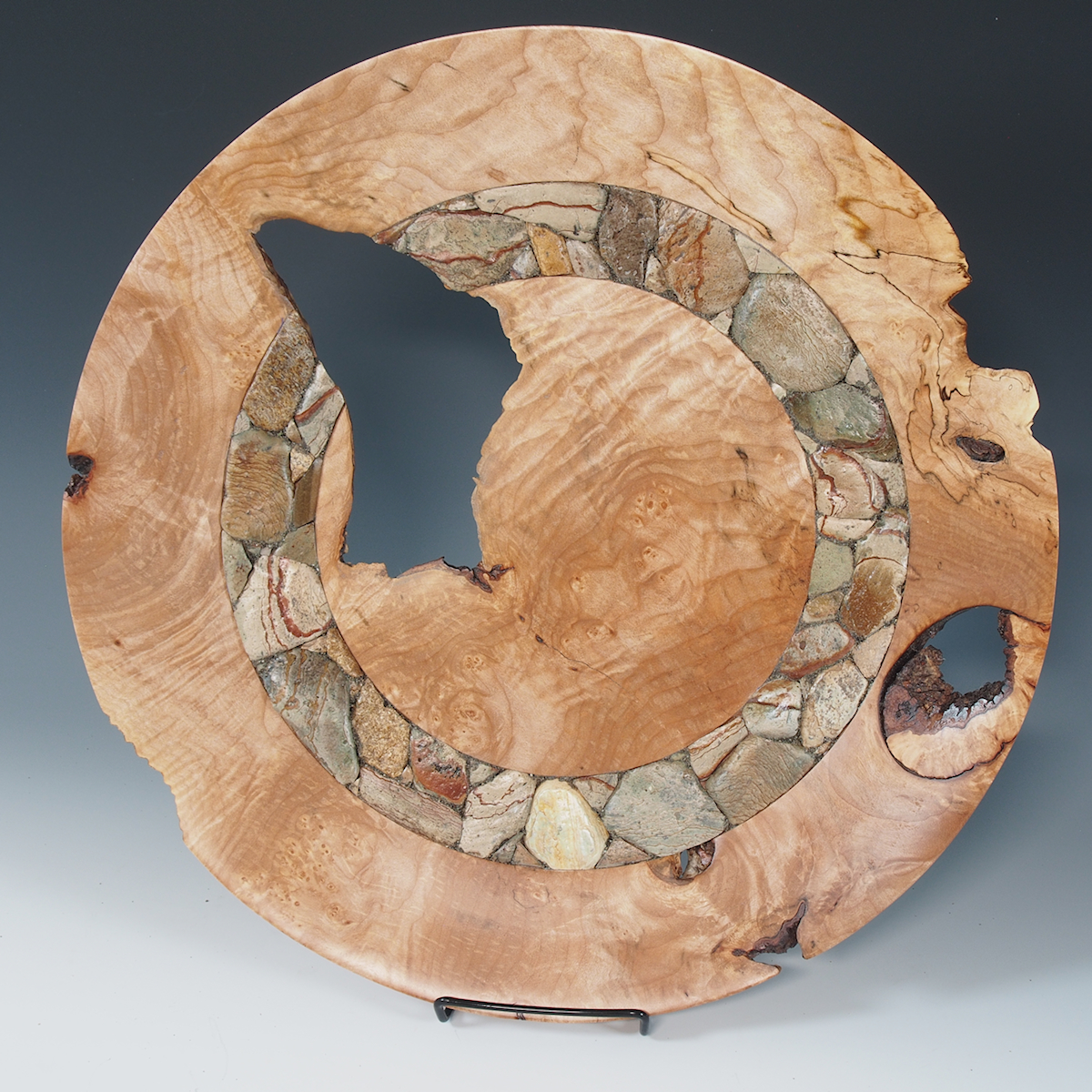 Figured Maple Art Platter woodturning with Stone inlay by Jim Hodson. 16 1/2″ Diameter