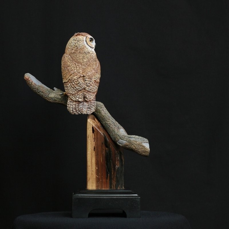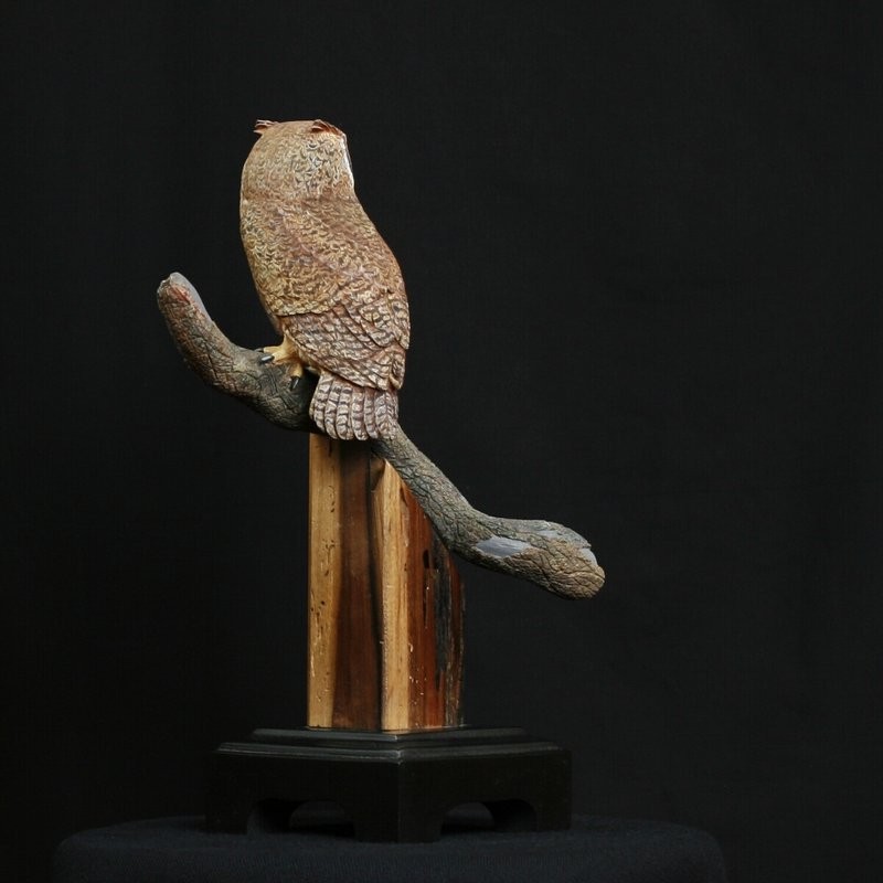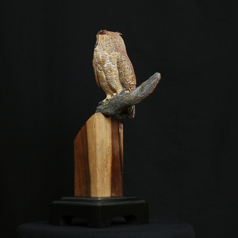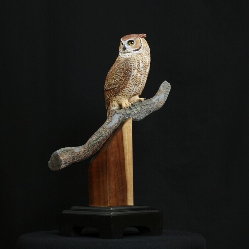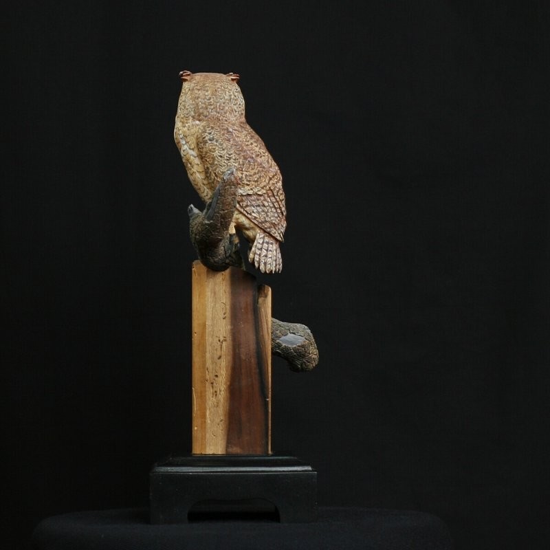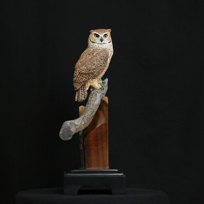 The Miniature Horned Owl is carved out of Tupelo