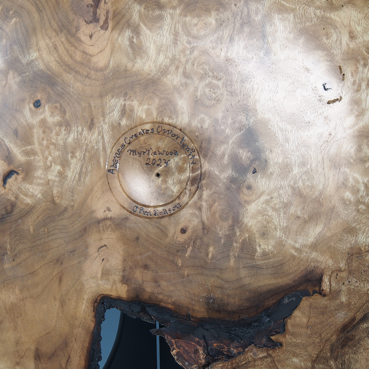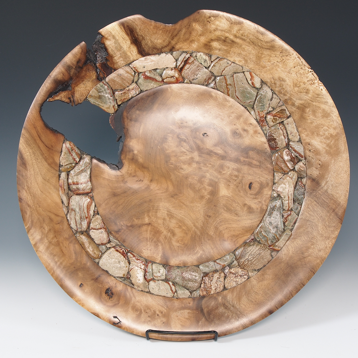 Myrtle Burl Art Platter woodturning with River Stone inlay by Jim Hodson. 17″ Diameter