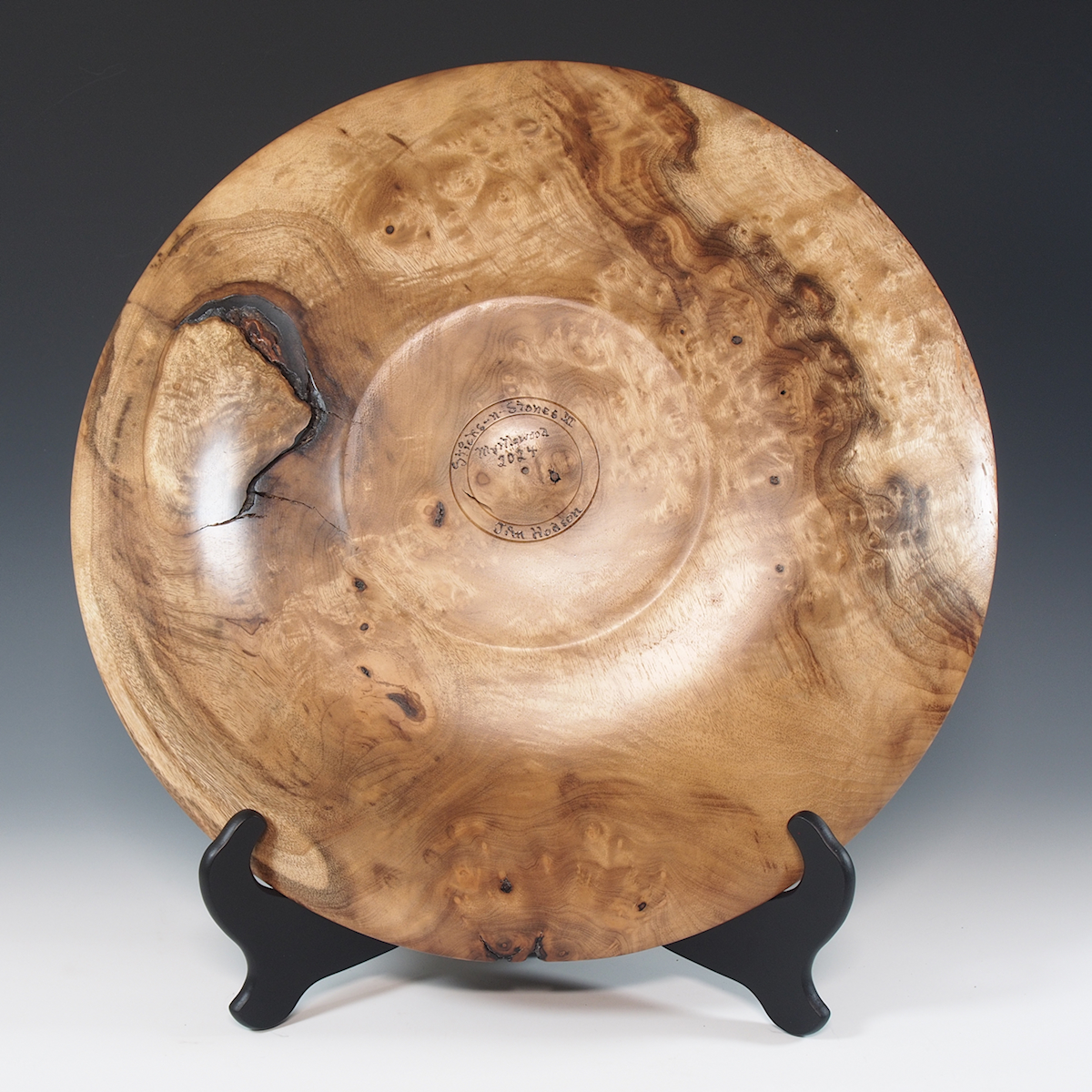 Myrtle Burl Art Platter woodturning with River Stone inlay by Jim Hodson. 17″ Diameter