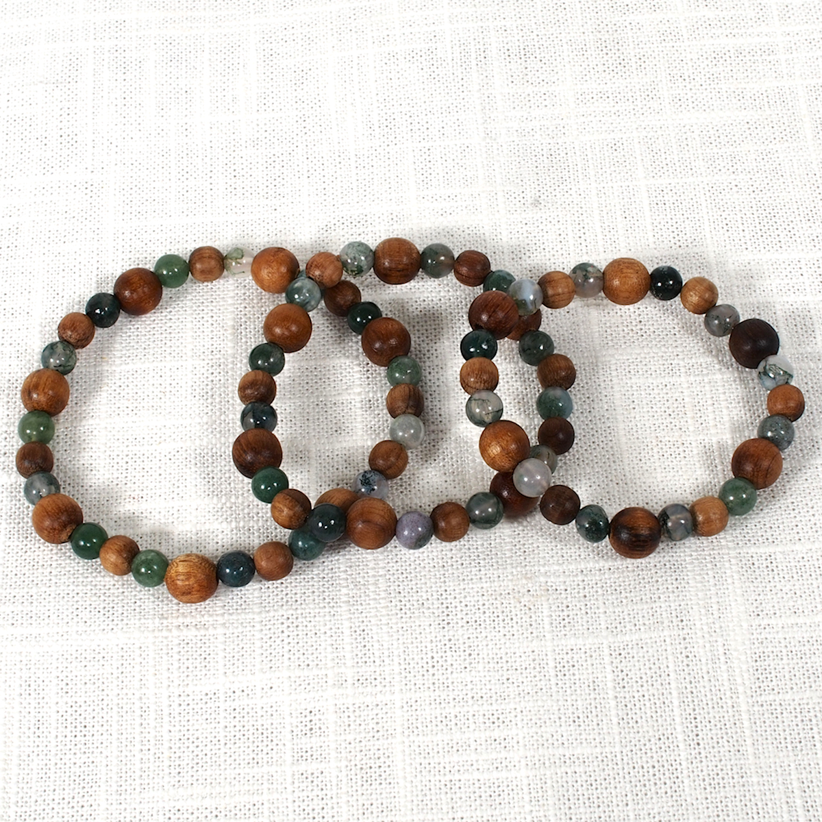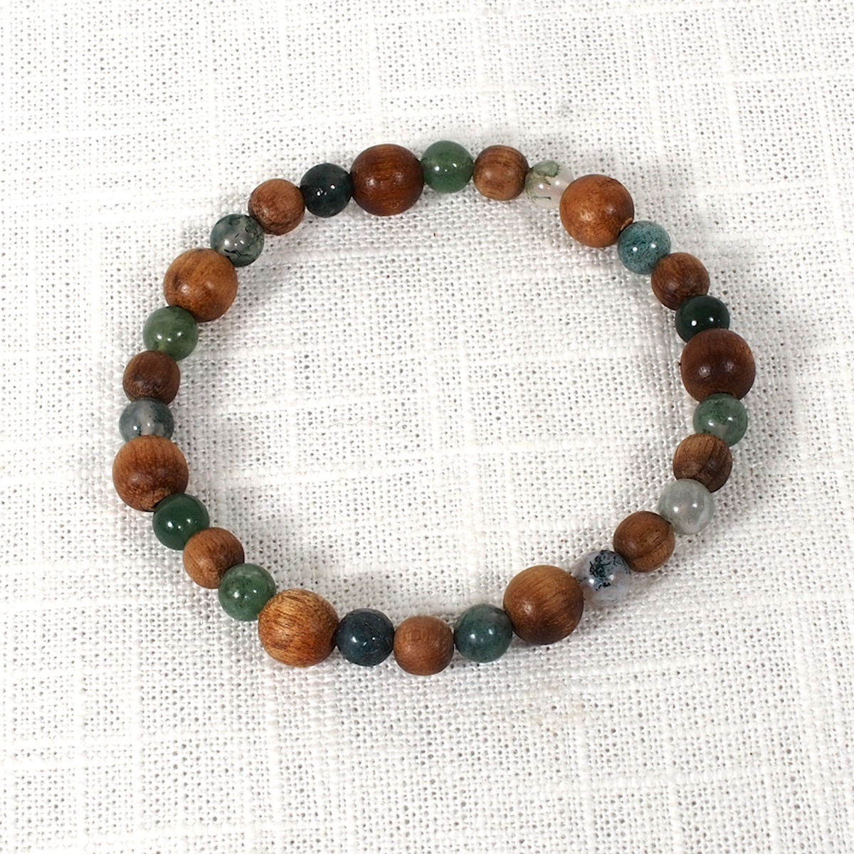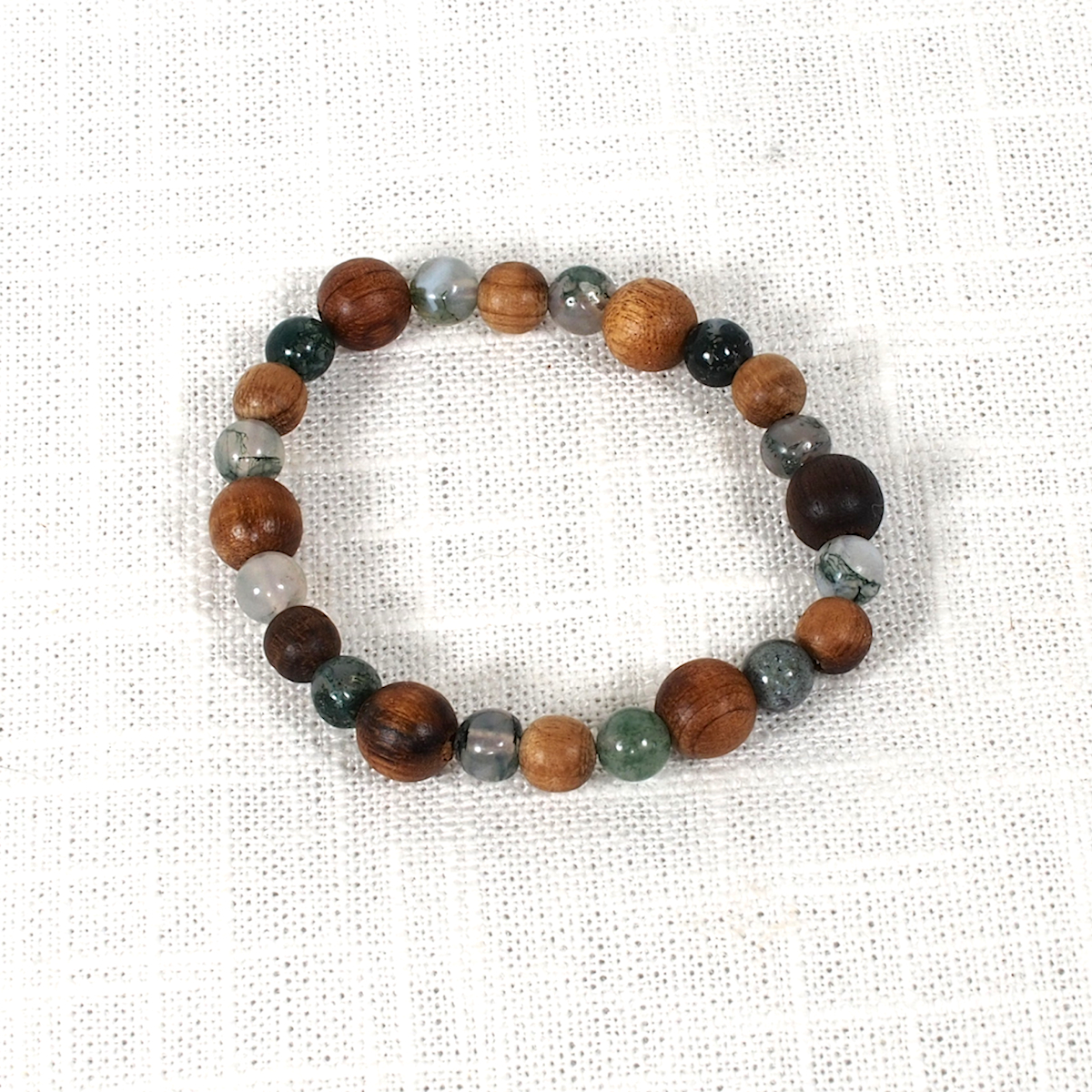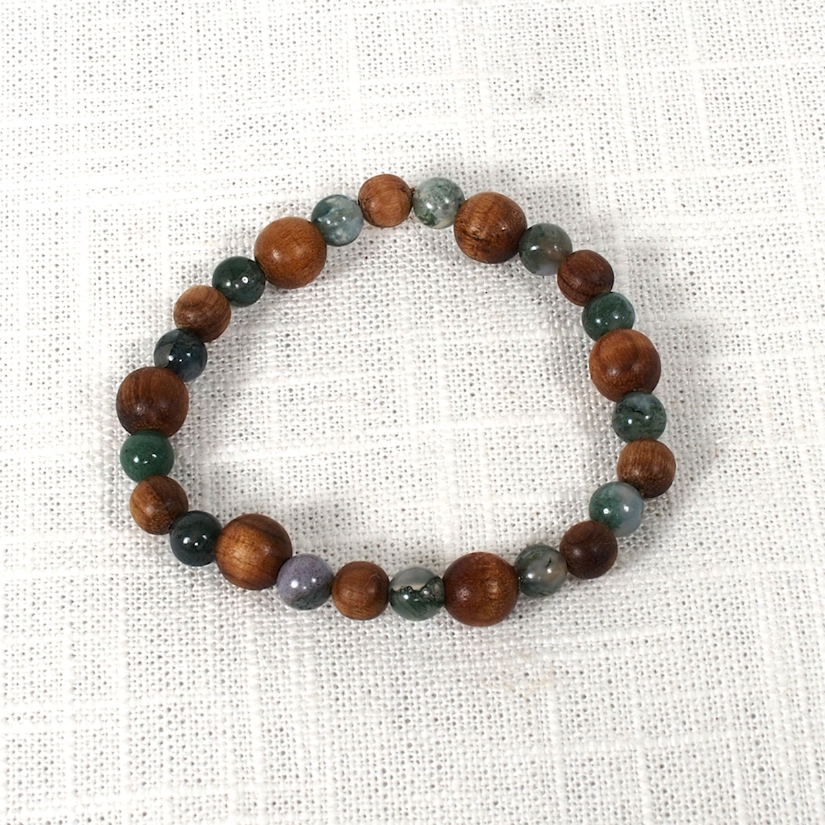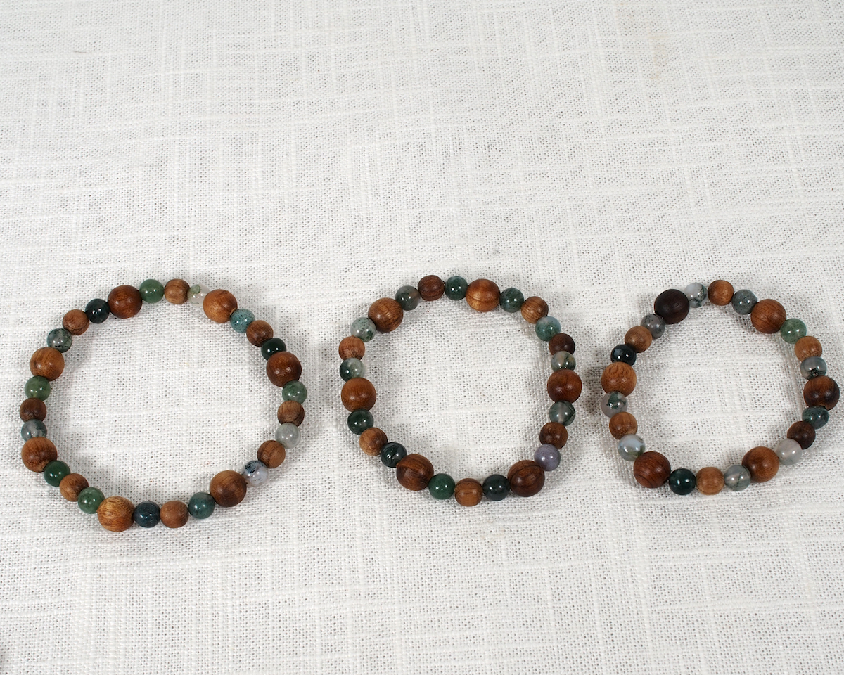 Myrtlewood and Moss Agate Gemstone Beads on a stretchy power cord.