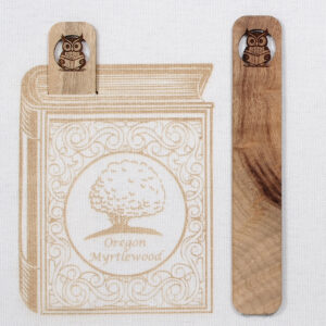 Each bookmark is made from a single piece of thinly sliced myrtlewood and is approximately 1/16th inch thick, 1 inch wide, and 5 3/4 inches long.