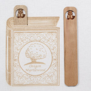 Each bookmark is made from a single piece of thinly sliced myrtlewood and is approximately 1/16th inch thick, 1 inch wide, and 5 3/4 inches long.