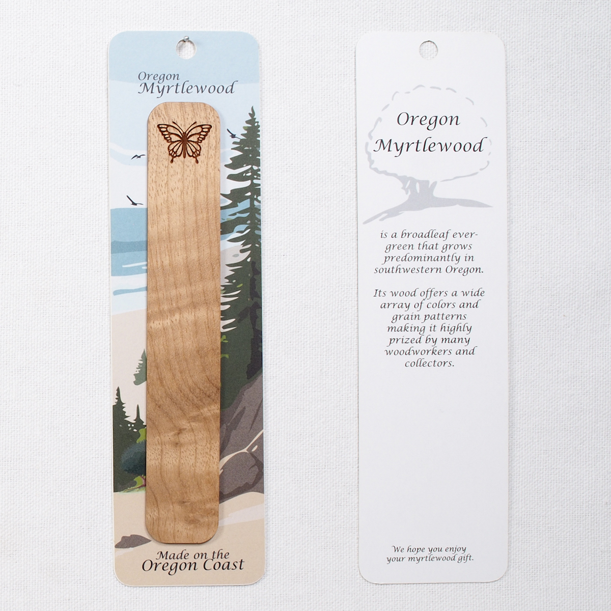 Each bookmark is made from a single piece of thinly sliced myrtlewood and is approximately 1/16th inch thick, 1 inch wide, and 5 3/4 inches long.