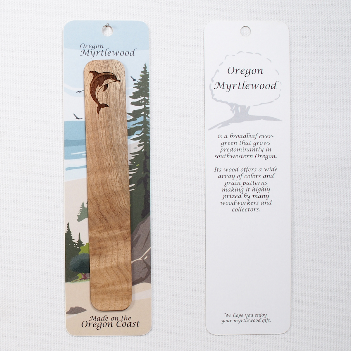 Each bookmark is made from a single piece of thinly sliced myrtlewood and is approximately 1/16th inch thick, 1 inch wide, and 5 3/4 inches long.