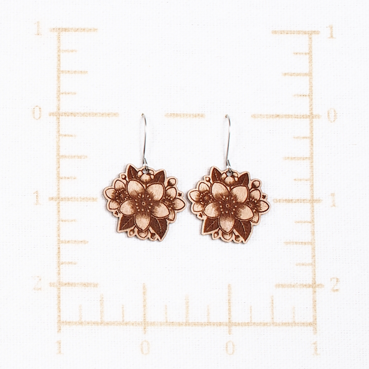 Myrtlewood Dangle Earrings with engraved Cherry Blossoms with stainless steel fishhook style ear wires.