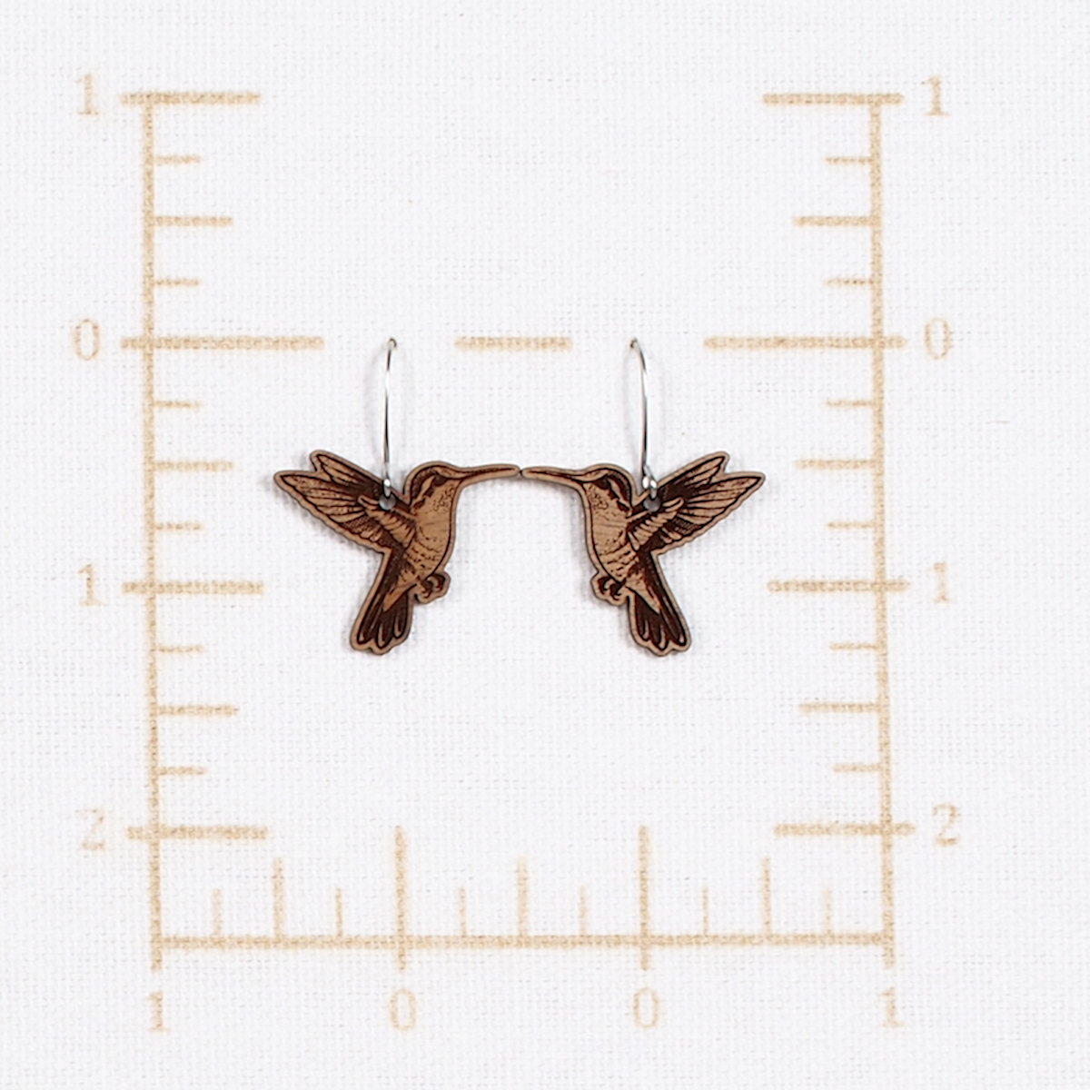 Myrtlewood Dangle Earrings with engraved Hummingbird with stainless steel fishhook style ear wires.