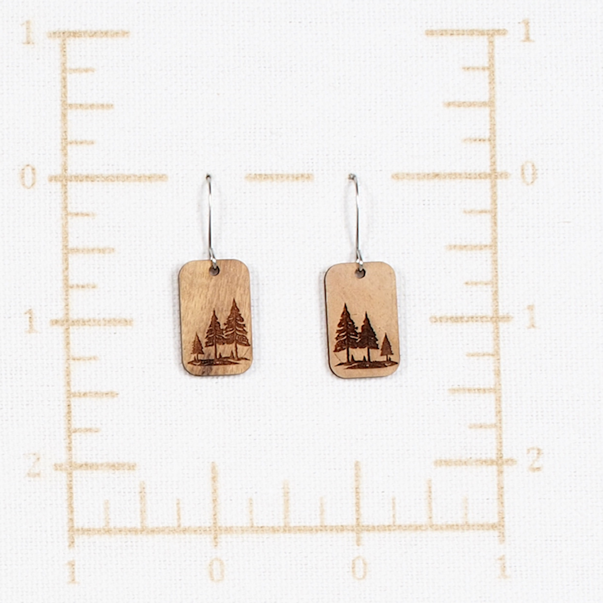 Myrtlewood Dangle Earrings with engraved 3 trees on a 1/2 x 3/4 inch rectangle with stainless steel fishhook style ear wires. Wood color and grain pattern varies.