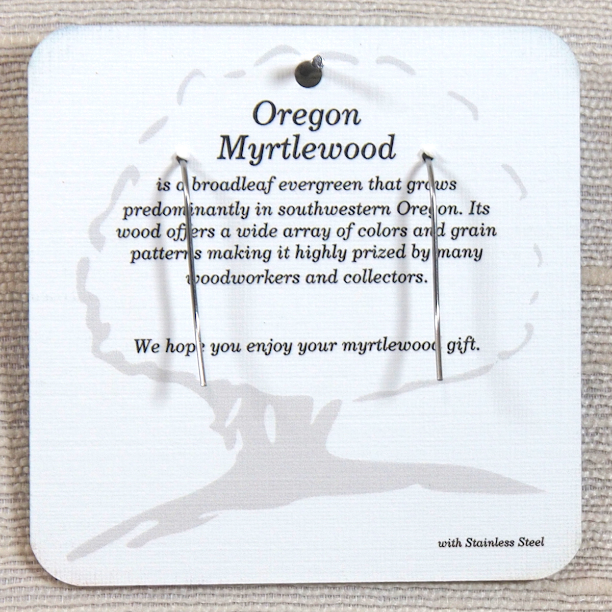 Myrtlewood Dangle Earrings with engraved Whale Tail on a 1/2 x 3/4 inch rectangle with stainless steel fishhook style ear wires. Wood color and grain pattern varies.