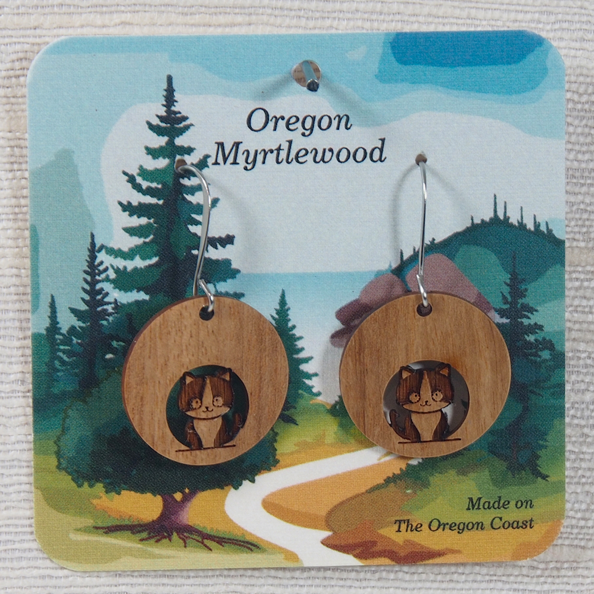Myrtlewood Dangle Earrings with engraved Cat on a 3/4 inch round with stainless steel fishhook style ear wires. Wood color and grain pattern varies.