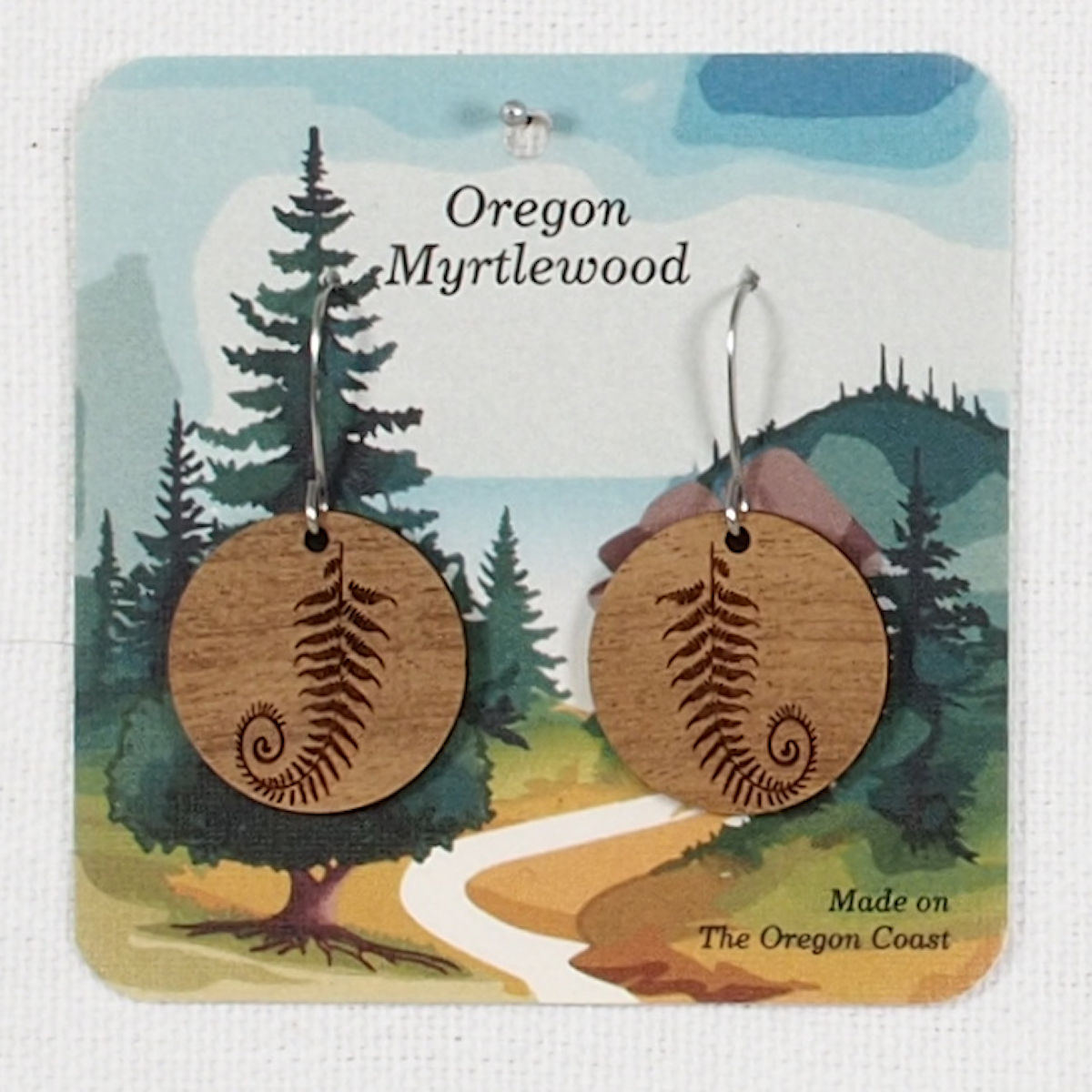 Myrtlewood Dangle Earrings with engraved Fern Leaves on a 3/4 inch round with stainless steel fishhook style ear wires. Wood color and grain pattern varies.
