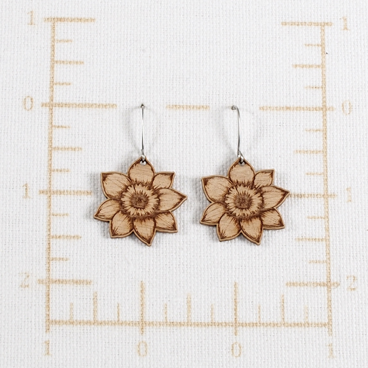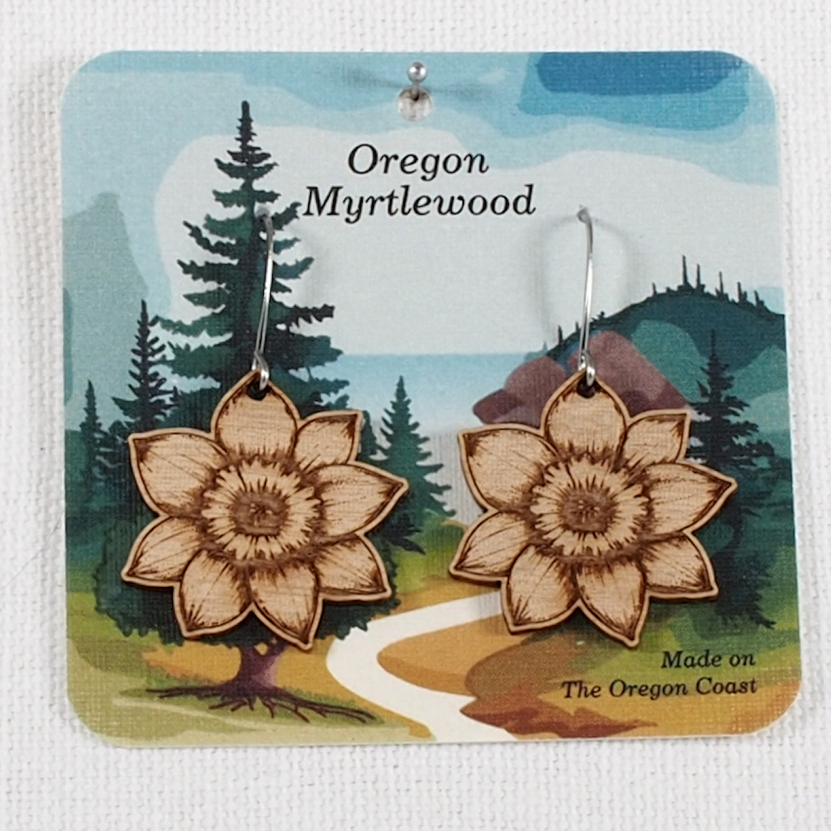 Myrtlewood Dangle Earrings with engraved Wildflower with stainless steel fishhook style ear wires.