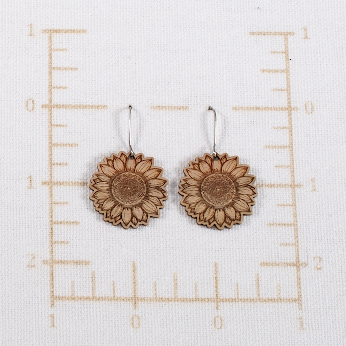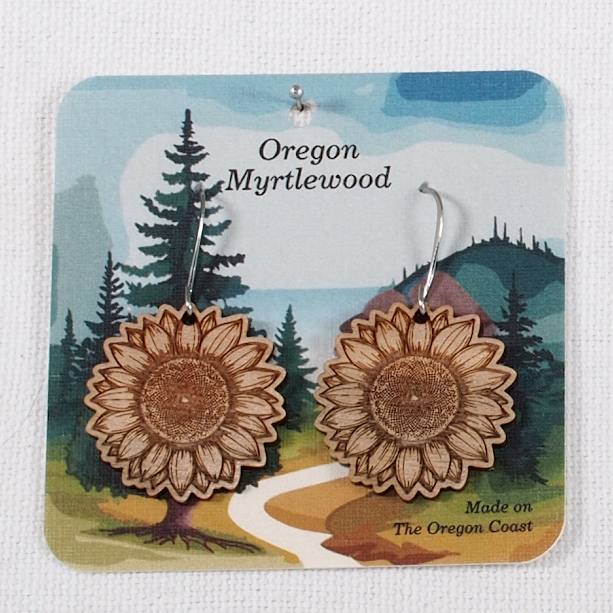 Myrtlewood Dangle Earrings with engraved Sunflower with stainless steel fishhook style ear wires.