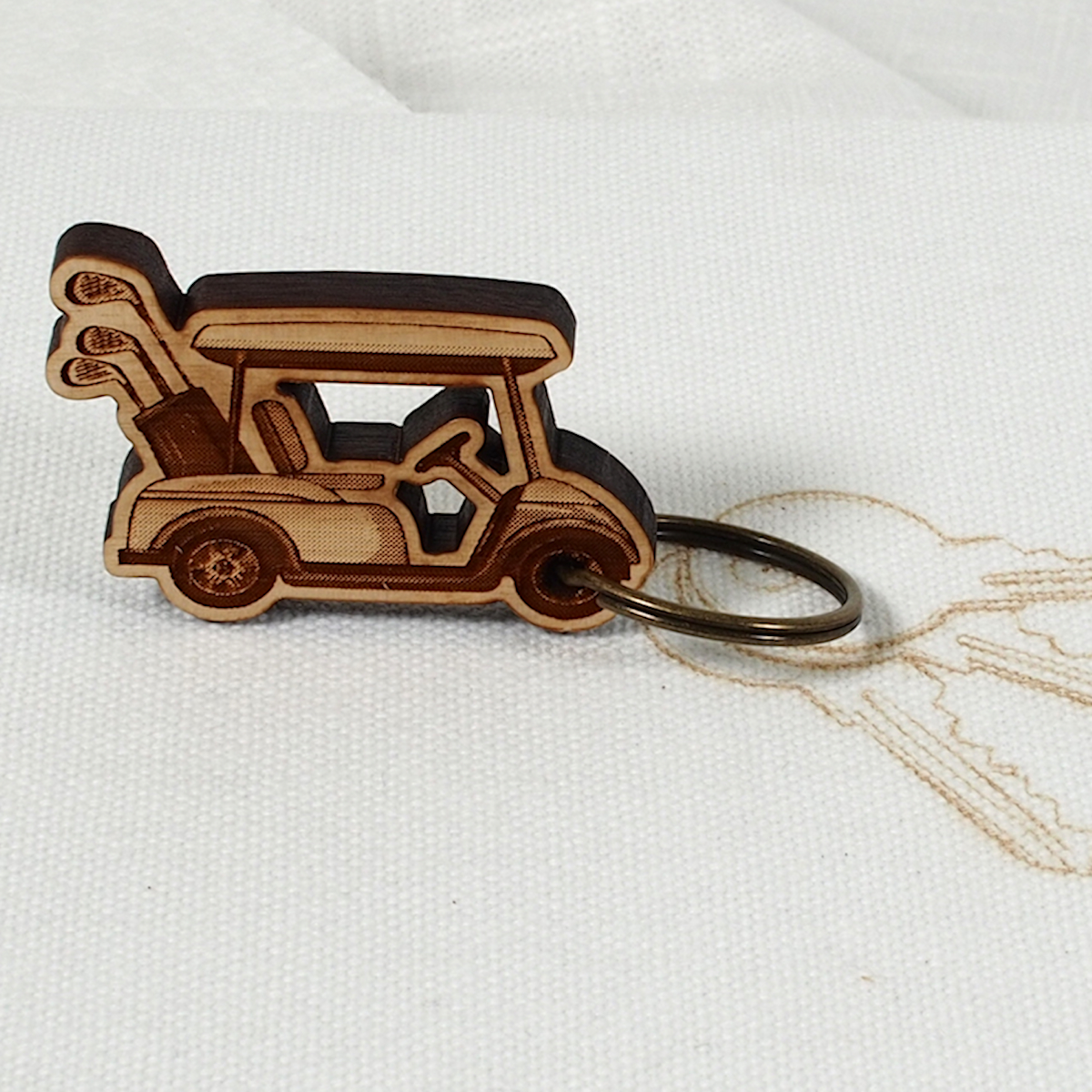 Myrtlewood Key ring. Laser engraved with a 1 inch split ring. Golf Cart is approximately 2 inches x 1 1/4 inches high.