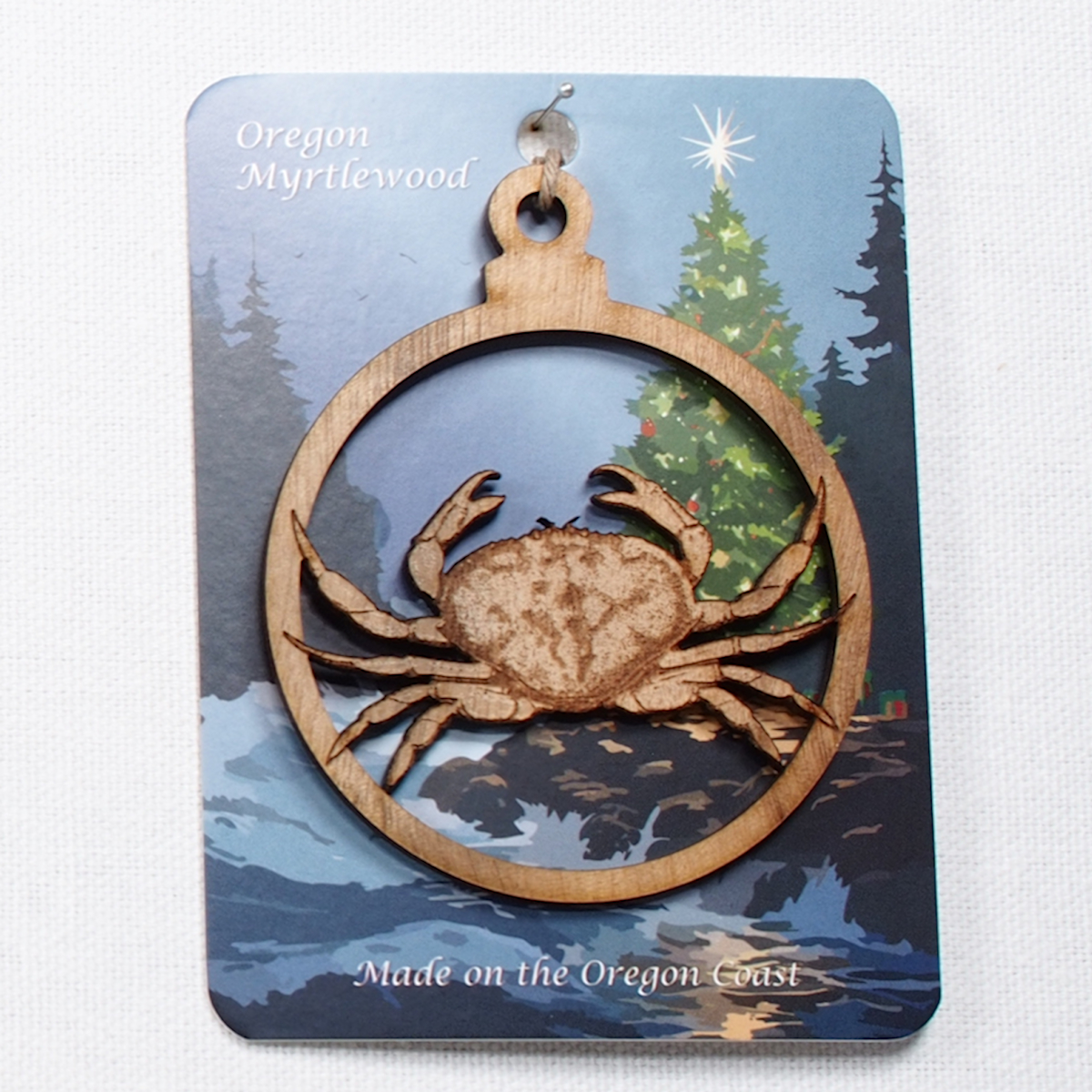 These wonderful Wood Ornaments crafted out of Oregon Myrtlewood feature an engraving of a Dungeness Crab.