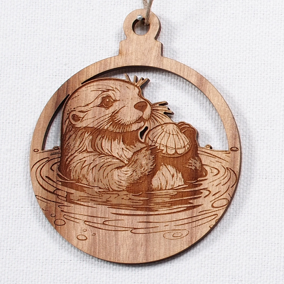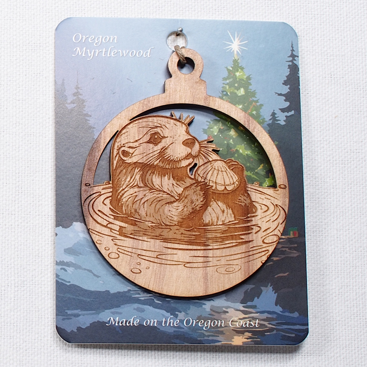 These wonderful Wood Ornaments crafted out of Oregon Myrtlewood feature an engraving of a happy little sea otter.
