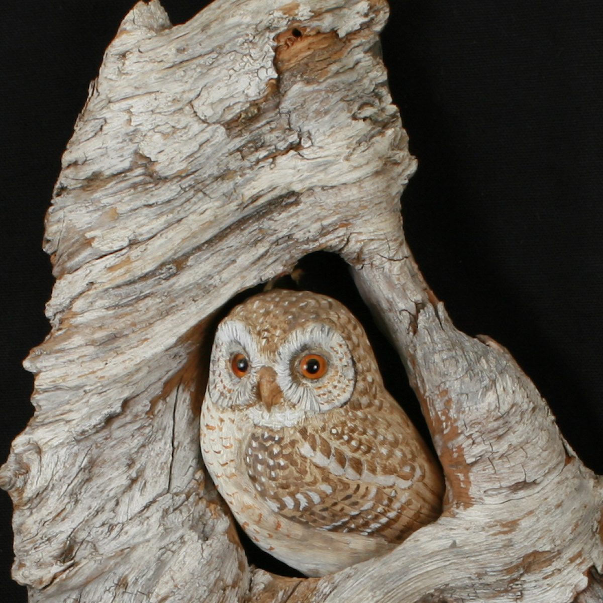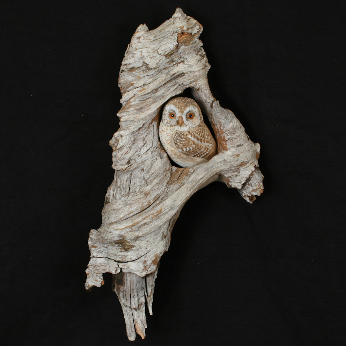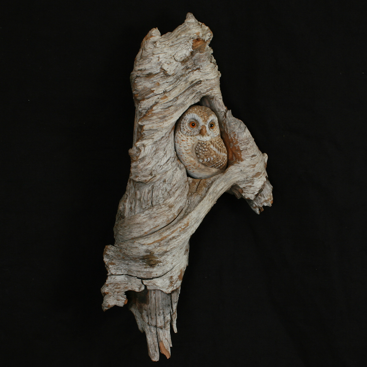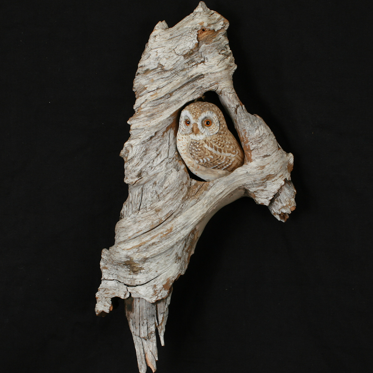 It is hand carved ,carefully textured and painted by Vern Hesketh, then mounted in this natural rustic piece of driftwood. He looks real.