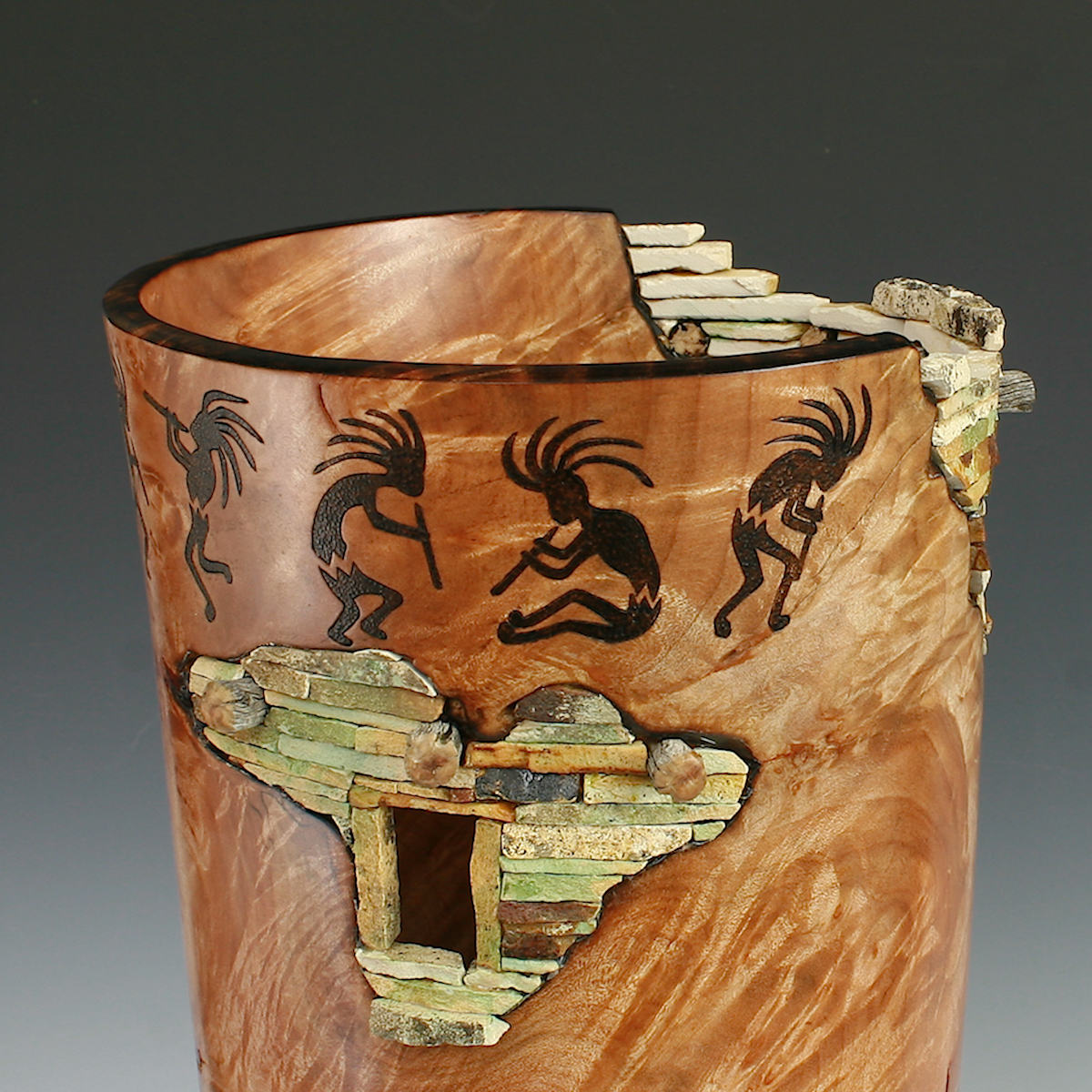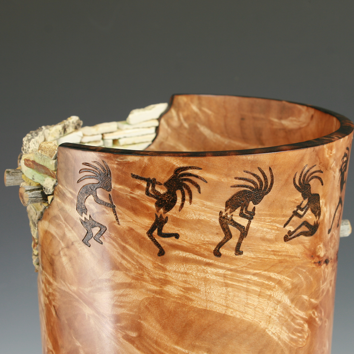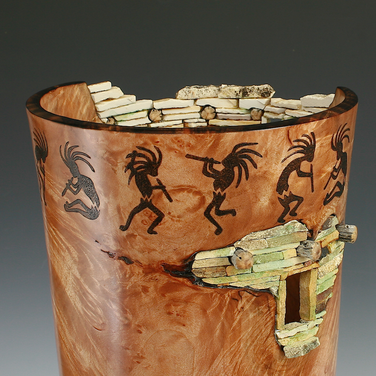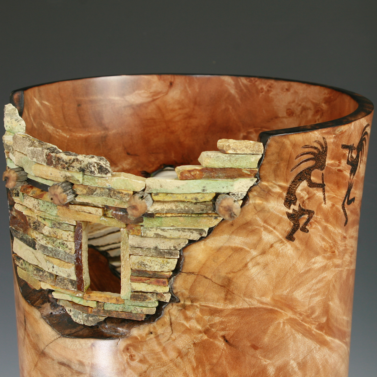 Anasazi Vessel by Jim Hodson. Designed with inspiration from the Anasazi Cliff dewllings in Chaco Canyon and Mesa Verde. Jim has developed an awesome new technique incorporating slices of rhyolite and ignimbrite stone which he has gathered in Central Oregon into his woodturning. This Vase is made from a beautiful figured Oregon Maple Burl with woodburned Kokopeli figures along the rim.