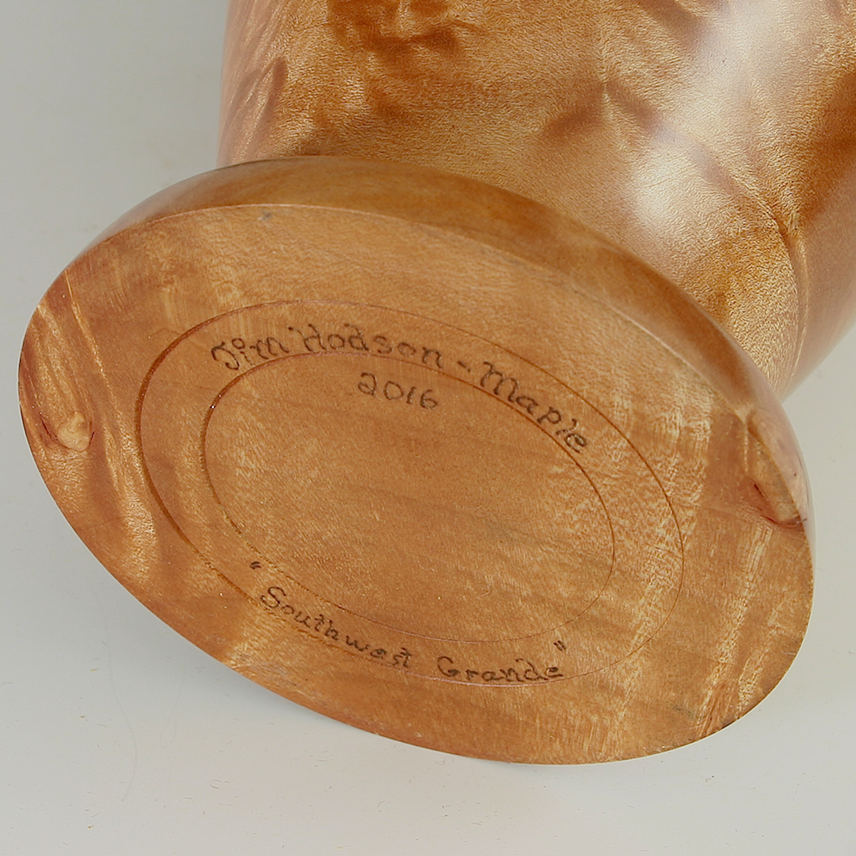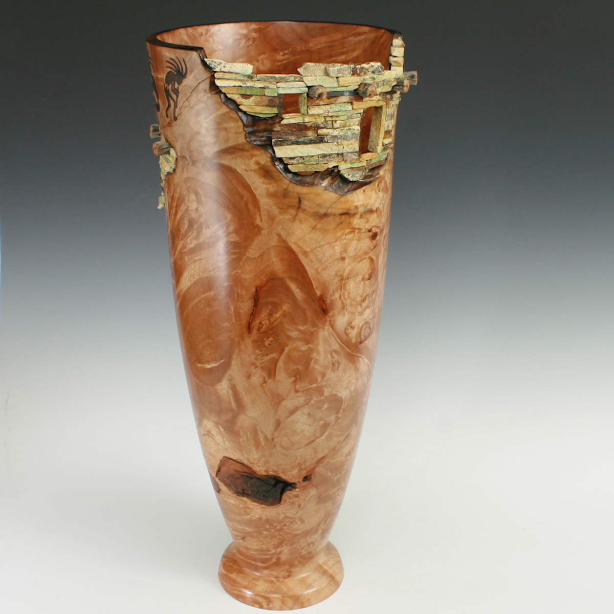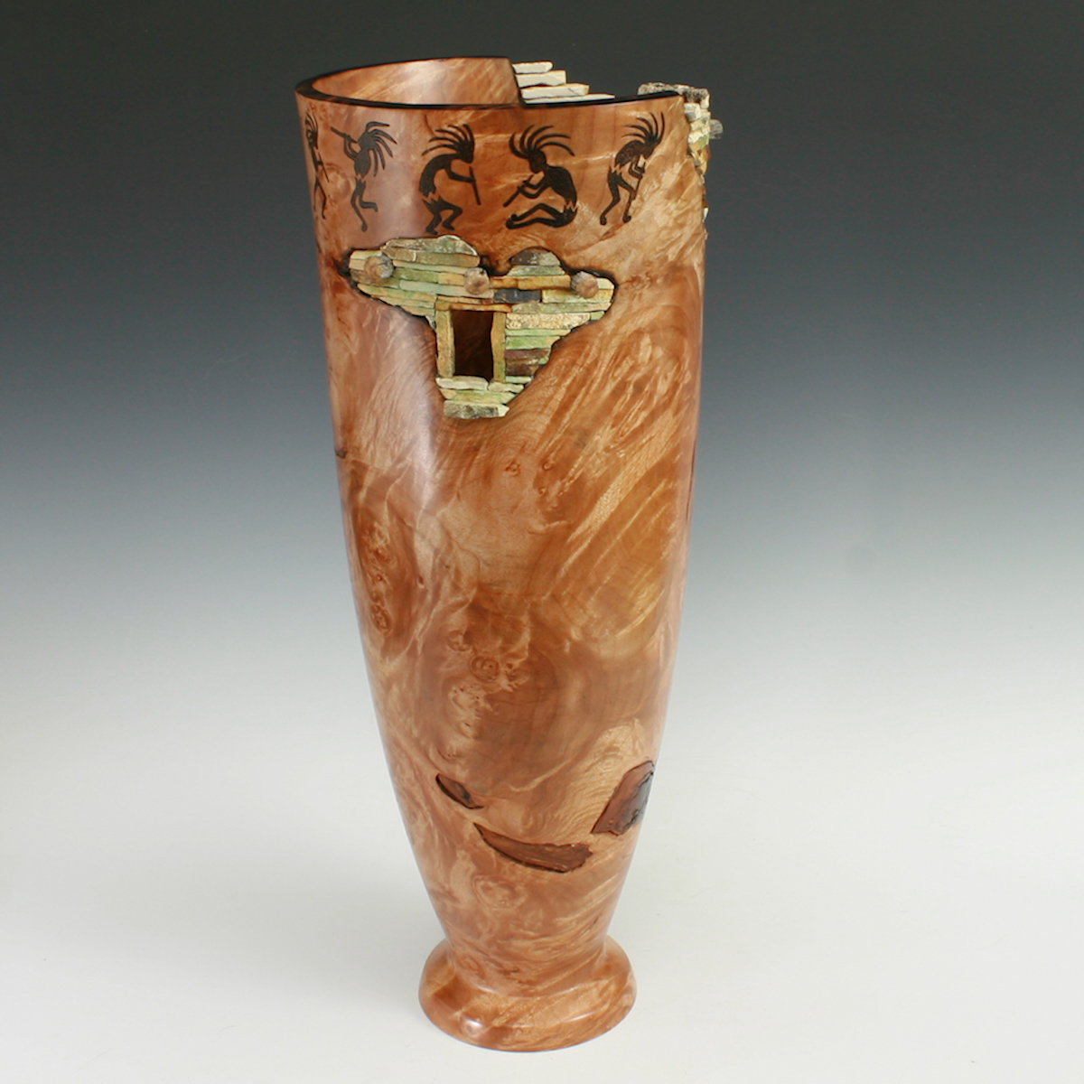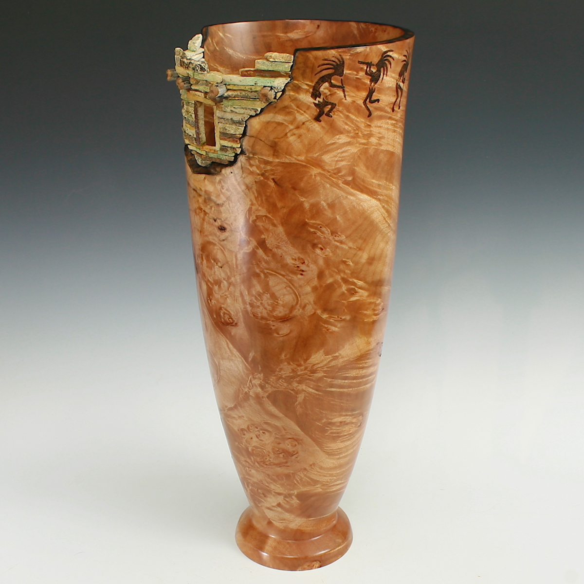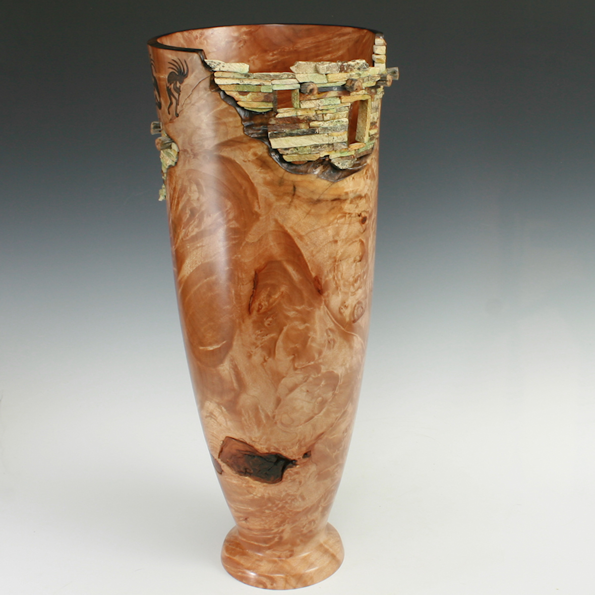 Anasazi Vessel by Jim Hodson. Designed with inspiration from the Anasazi Cliff dewllings in Chaco Canyon and Mesa Verde. Jim has developed an awesome new technique incorporating slices of rhyolite and ignimbrite stone which he has gathered in Central Oregon into his woodturning. This Vase is made from a beautiful figured Oregon Maple Burl with woodburned Kokopeli figures along the rim.
