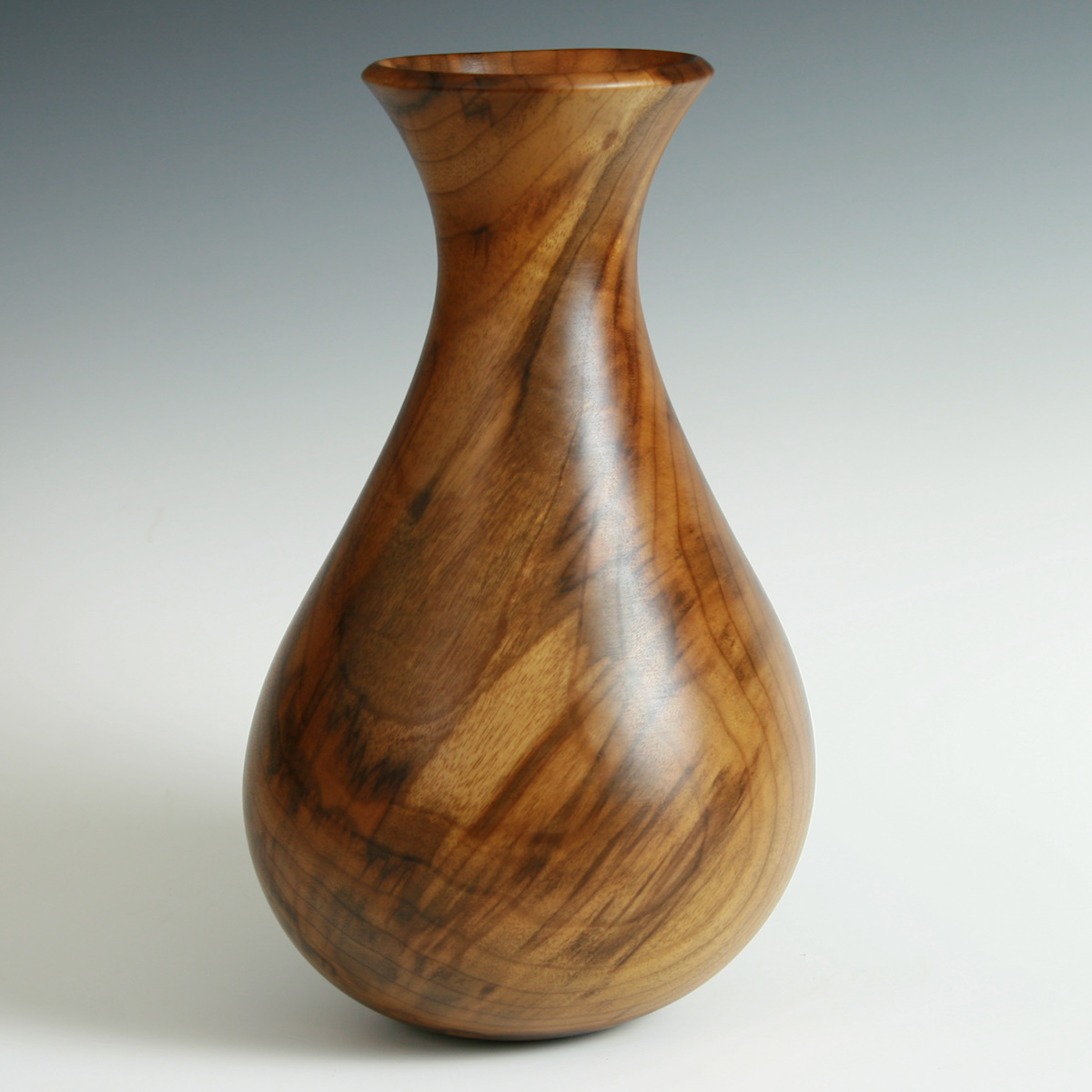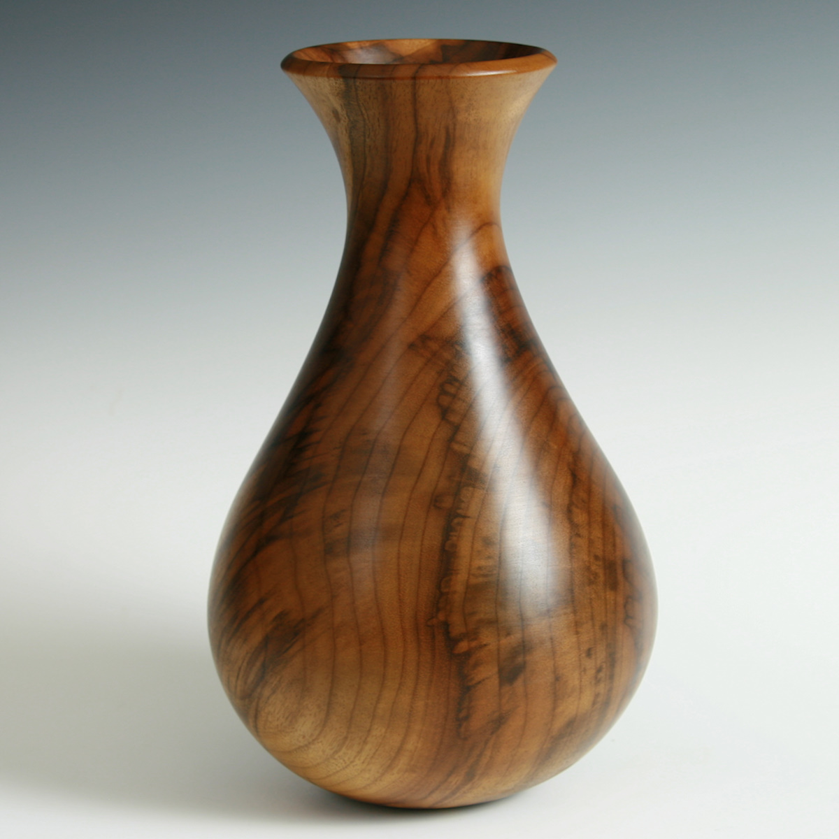 This vessel represents a technical accomplishment experienced woodturners would appreciate. Even wall thickness with excellent flow and shape turned through the long narrow neck.